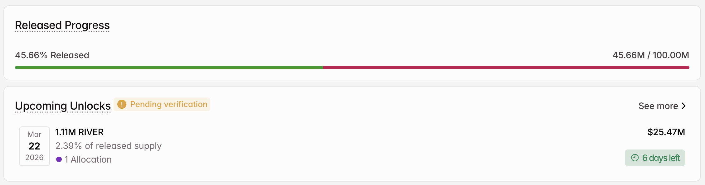 Am 22. März schaltet das Team 1,11 Millionen RIVER im Wert von rund 25,47 Millionen USD frei. Die Token stehen für 2,39% der freigegebenen Menge. Die gesamte freigeschaltete Menge erhält die Foundation des Ökosystems.