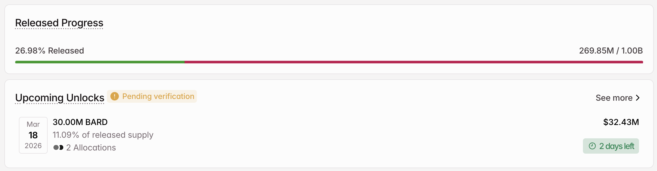 Am 18. März wird das Team 30 Millionen BARD im Wert von 32,43 Millionen USD freigeben. Diese Token machen 11,09% der freigegebenen Menge aus.
