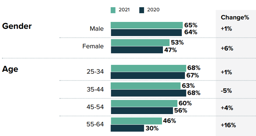 Vielleicht noch bedeutsamer ist die Tatsache, dass ältere Anleger ein wachsendes Interesse an Bitcoin-Anlageprodukten zeigten. 46% der 55- bis 64-Jährigen sind an BTC-Anlageprodukten interessiert, während es im Jahr 2020 nur 30% waren. Das Interesse der weiblichen Anleger stieg ebenfalls von 47% im Jahr 2020 auf 53% im Jahr 2021.