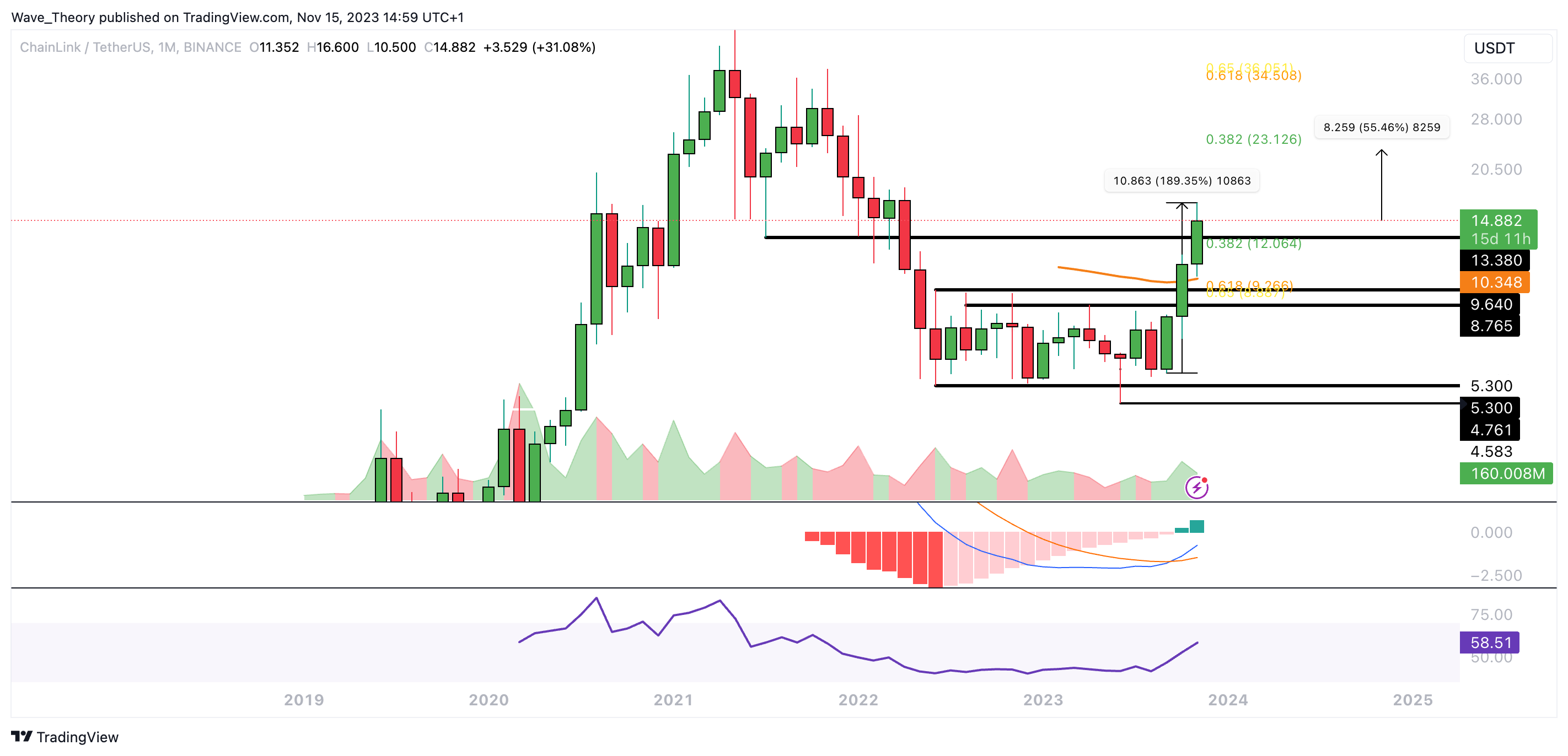 Auch im Monatschart von Chainlink zeigen sich die Indikatoren bullisch