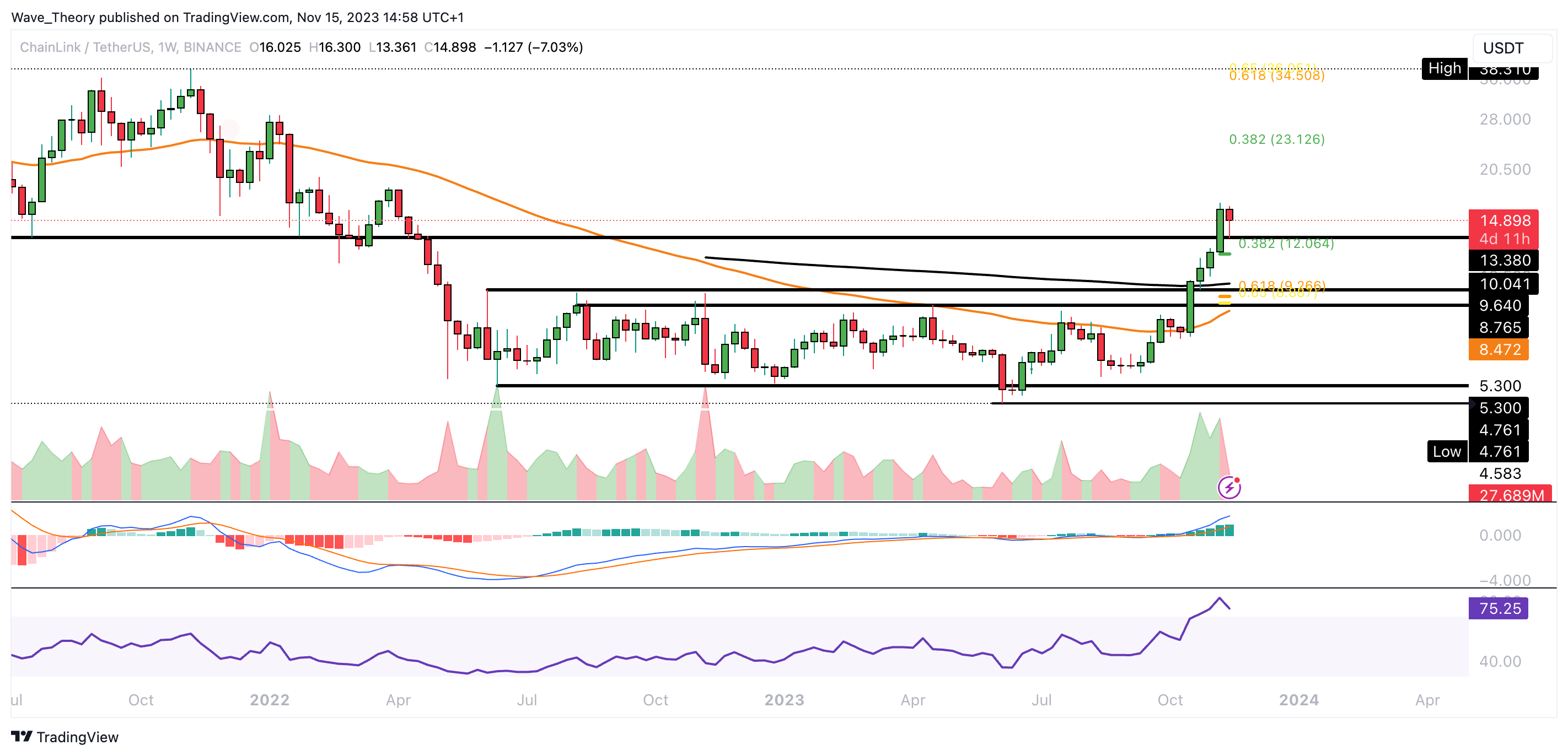 Sollte Chainlink die Aufwärtsbewegung mittelfristig fortsetzen, warten bei rund 23 USD und 35 USD die nächsten signifikanten Fib Widerstände. Das entspricht einem Aufwärtspotenzial von rund 55 %.