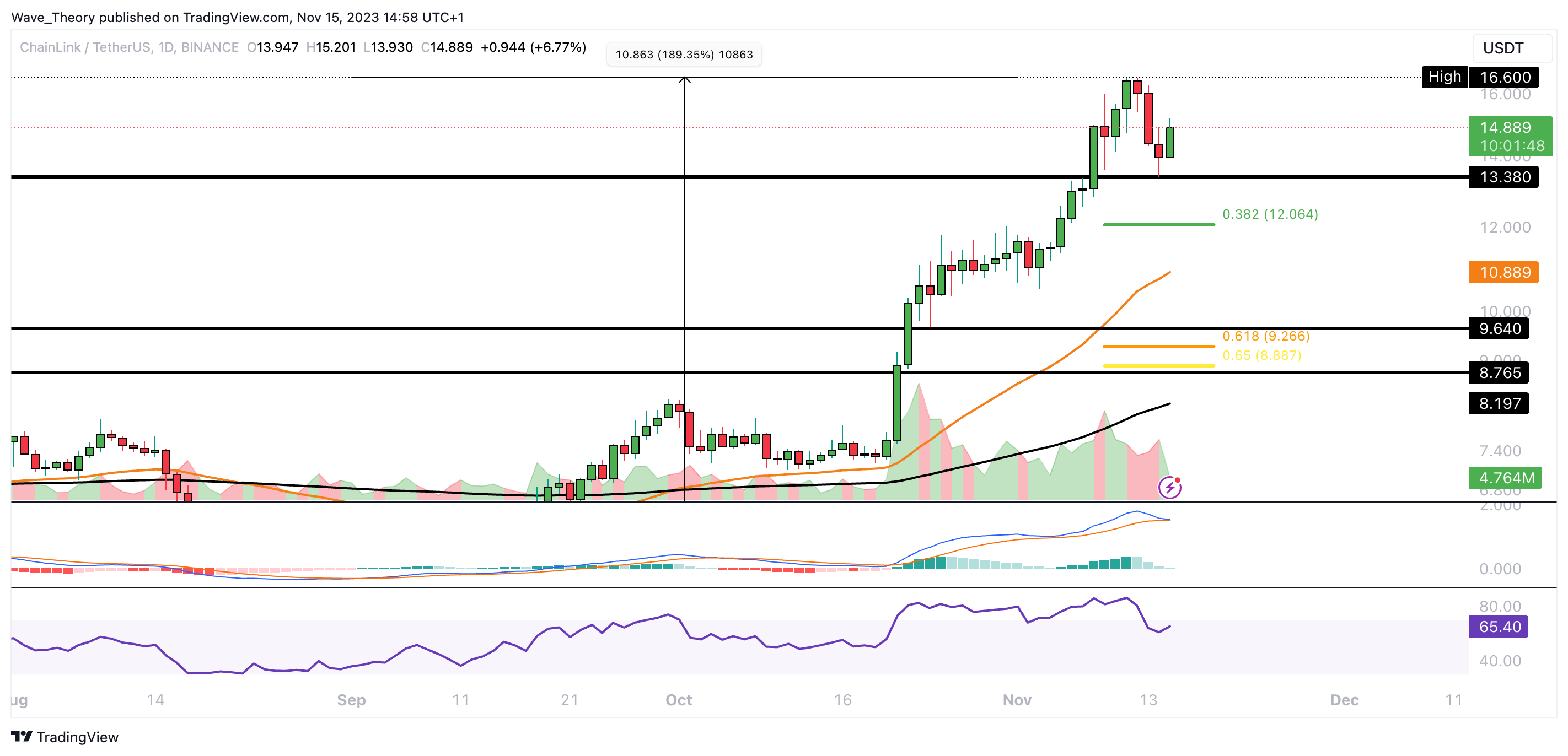 Der Chainlink Kurs ist zur horizontalen Unterstützung bei rund 13,38 USD korrigiert