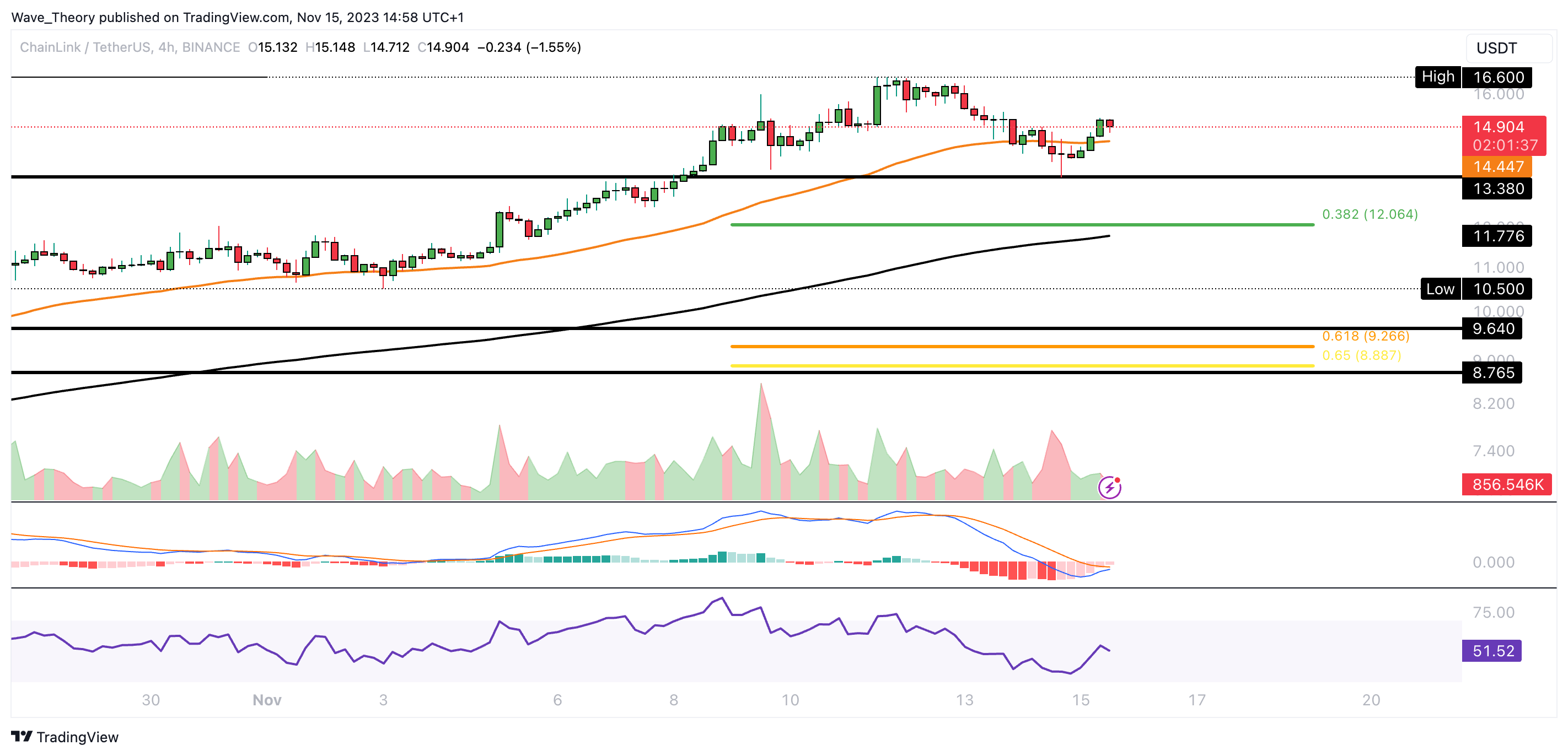 Nachdem der LINK Kurs den Golden Ratio Widerstand bei rund 13,2 USD brechen konnte, ist er bis rund 16,6 USD gestiegen. Anschließend hat Chainlink eine Korrektur eingeleitet, womit der Kurs zur horizontalen Unterstützung bei rund 13,38 USD korrigiert ist.