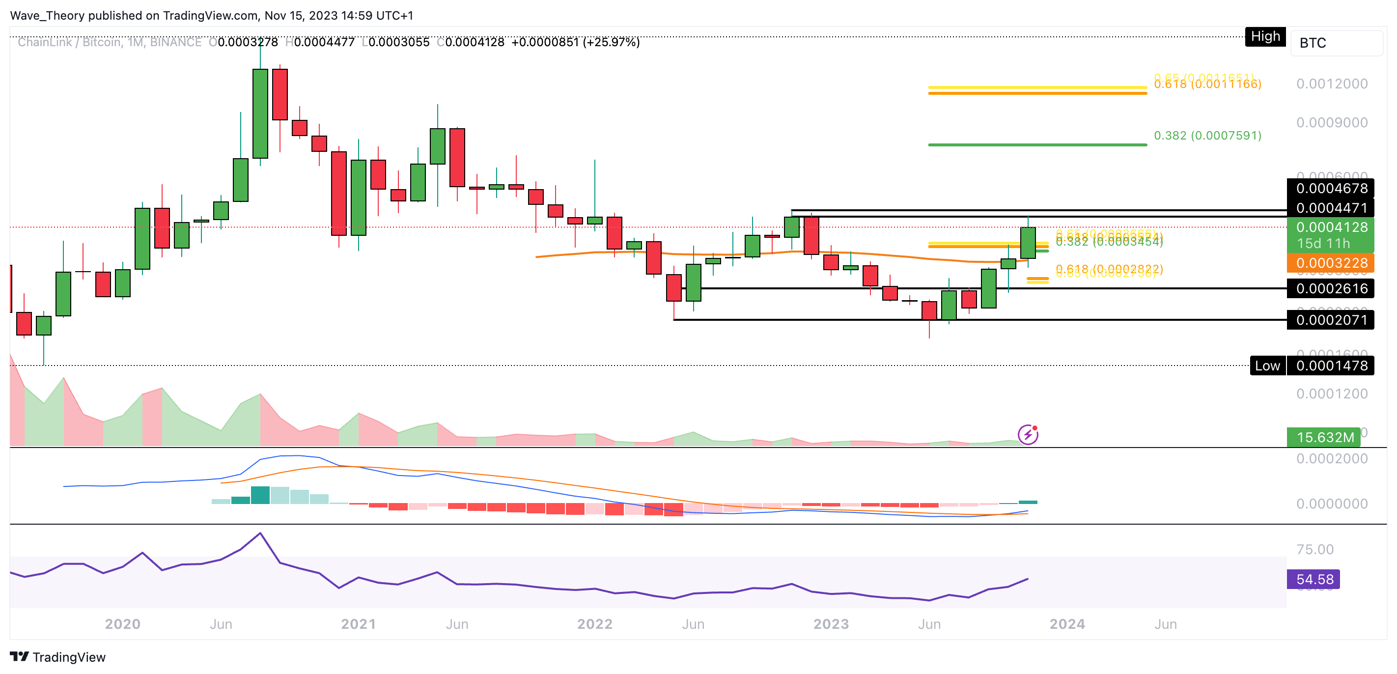 Auch gegen BTC konnte Chainlink den Golden Ratio Widerstand bei rund 0,00036 BTC brechen. Damit stößt der LINK Kurs jetzt zwischen rund 0,000447 BTC und 0,000468 BTC auf signifikanten Widerstand.