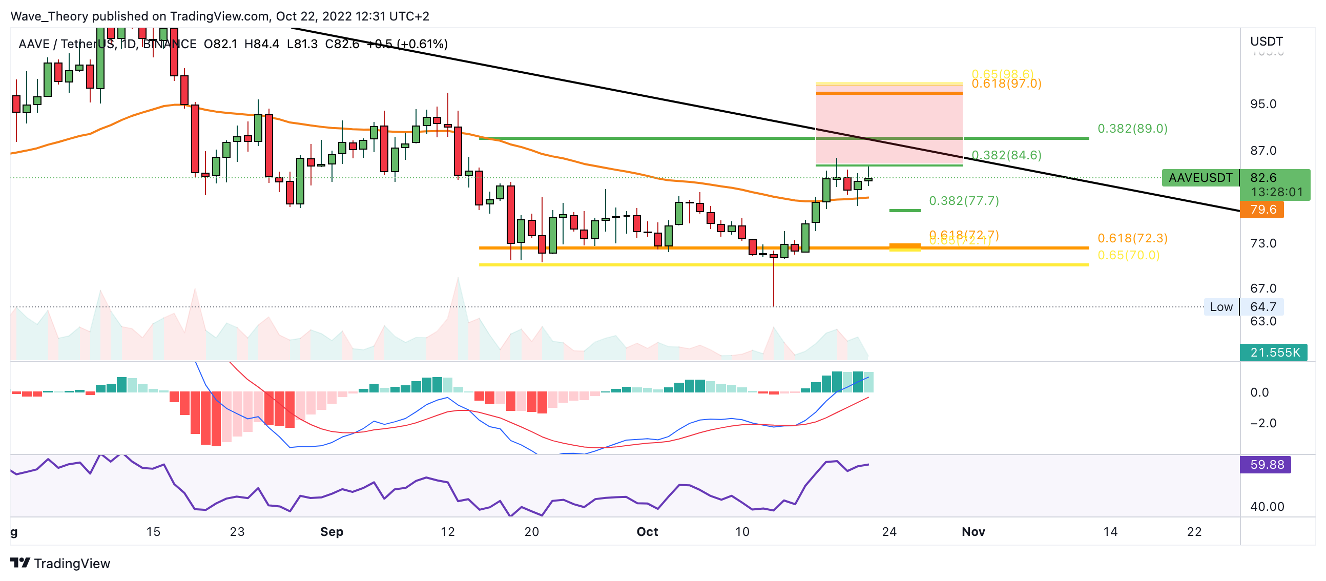 Zwischen 85 USD und 100 USD wartet jedoch signifikanter Widerstand auf den AAVE Kurs. Dort befinden sich zwei signifikante Fib Niveaus, durch welche die bärische Trendlinie verläuft. Sollte AAVE jetzt bei rund 85 USD abgewiesen werden, findet AAVE spätestens bei rund 77,7 USD und 72 USD signifikante Fibonacci Unterstützungen.
