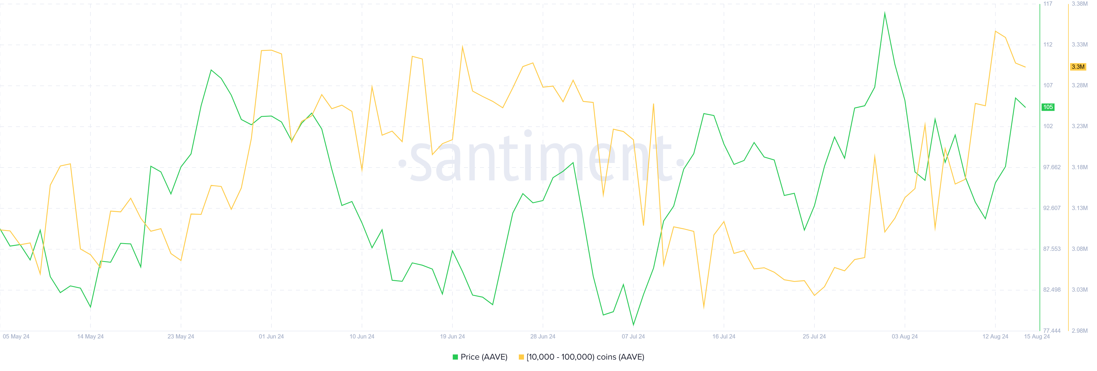 Die Adressen, die zwischen zehntausend und hunderttausend AAVE halten, haben seit Ende Juli kontinuierlich zugelegt. In den letzten 48 Stunden haben sie jedoch AAVE im Wert von über 5,25 Millionen USD verkauft.