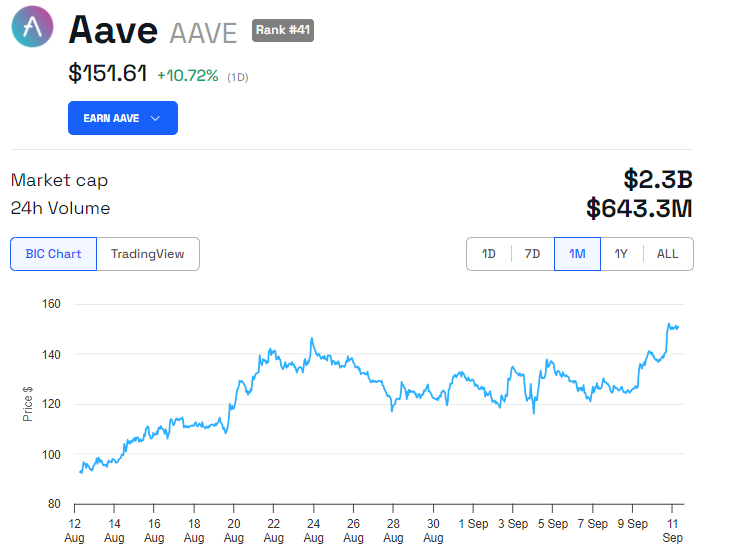 Diese Fortschritte haben zu einem signifikanten Anstieg des Wertes des AAVE-Tokens geführt, das in den letzten Monaten um mehr als 30 Prozent gestiegen ist. Daten von BeInCrypto zeigen, dass AAVE derzeit für 151,61 USD gehandelt wird, ein Anstieg von 10 Prozent seit Beginn der Sitzung am Mittwoch.