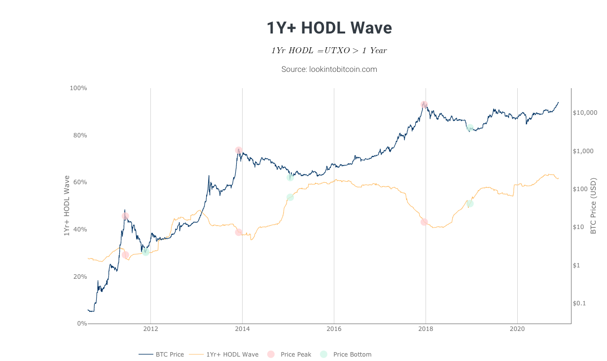 Doch was nützt eine immer knapper werdende Angebotsmenge, wenn Bitcoin Hodler ihre Bestände auf den Markt werfen? Zum Glück ist das Gegenteil der Fall. Ein Blick auf die „1Y+ Hodl Wave“, ein Indikator, der die Menge an UTXOs betrachtet, die länger als ein Jahr nicht bewegt wurden, lässt das Gesamtbild bullisher denn je erscheinen.