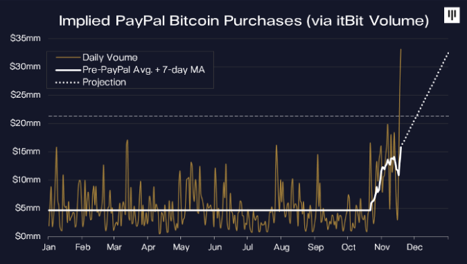 Und mehr noch. Denn wie vorhin vorgerechnet, kommen pro Tag BTC im Gegenwert von etwa 17 Millionen USD ins Spiel. Damit sorgt PayPal allein für genug Nachfrage, um 80 Prozent aller frischen BTC vom Markt zu nehmen (gestrichelte weiße Linie in der Graphik).