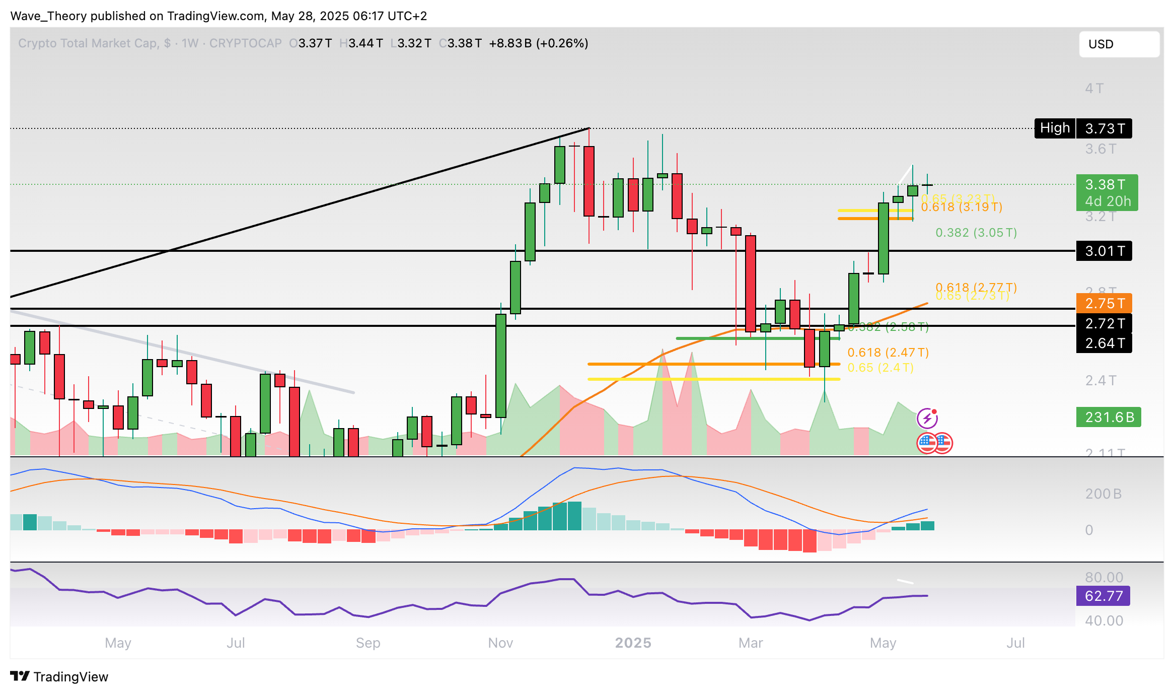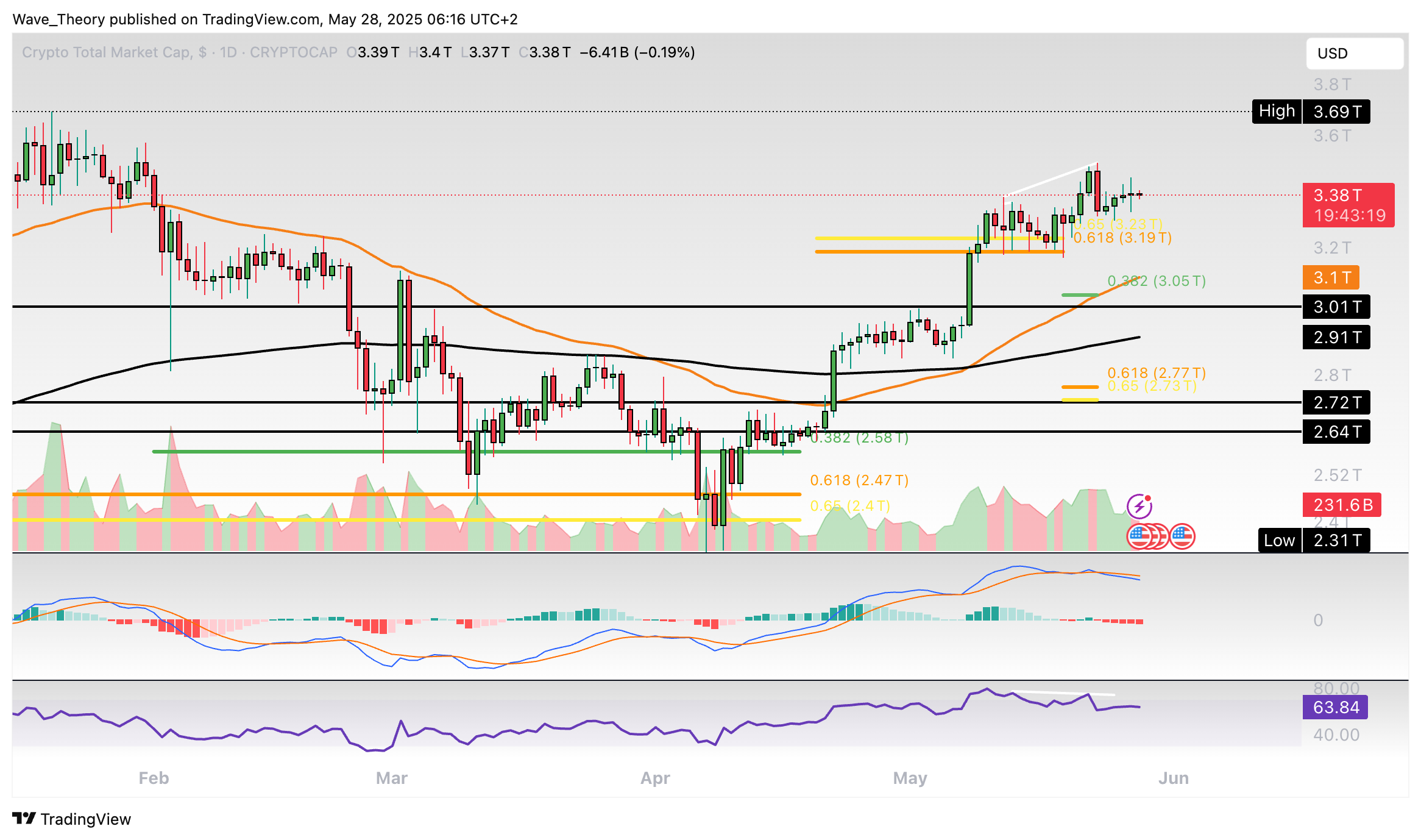 Zwar konnte der Markt den entscheidenden Golden Ratio Widerstand bei rund 3,2 Billionen USD bereits überwinden. Doch jetzt schwächelt der Markt.