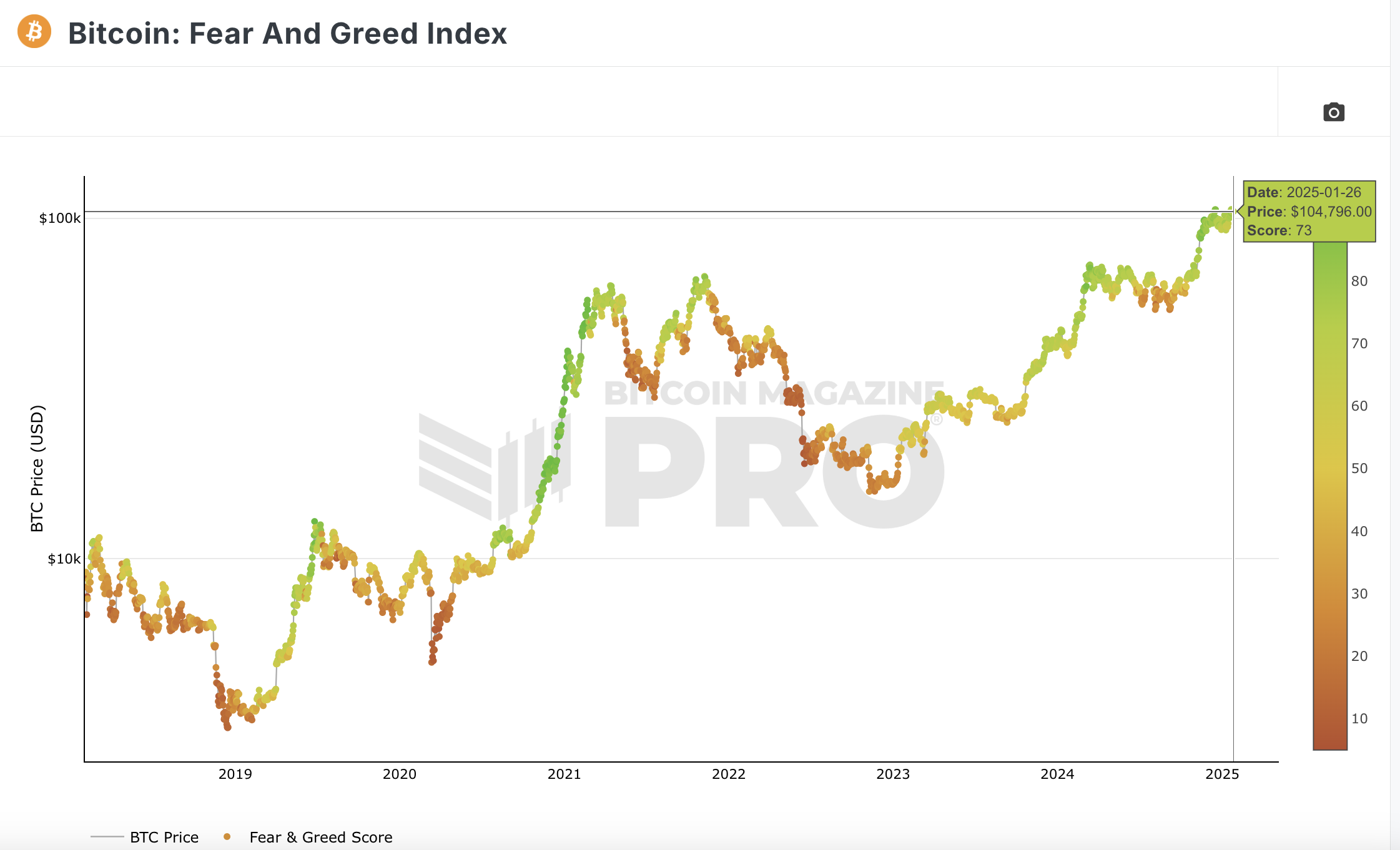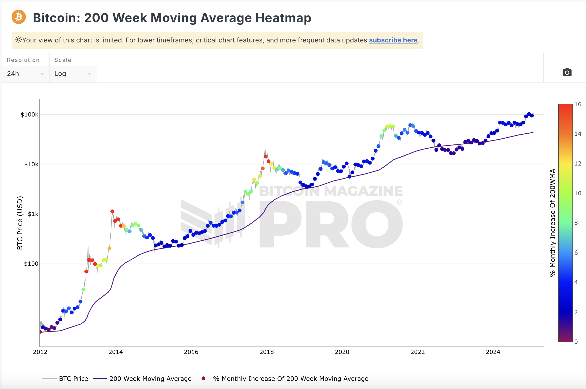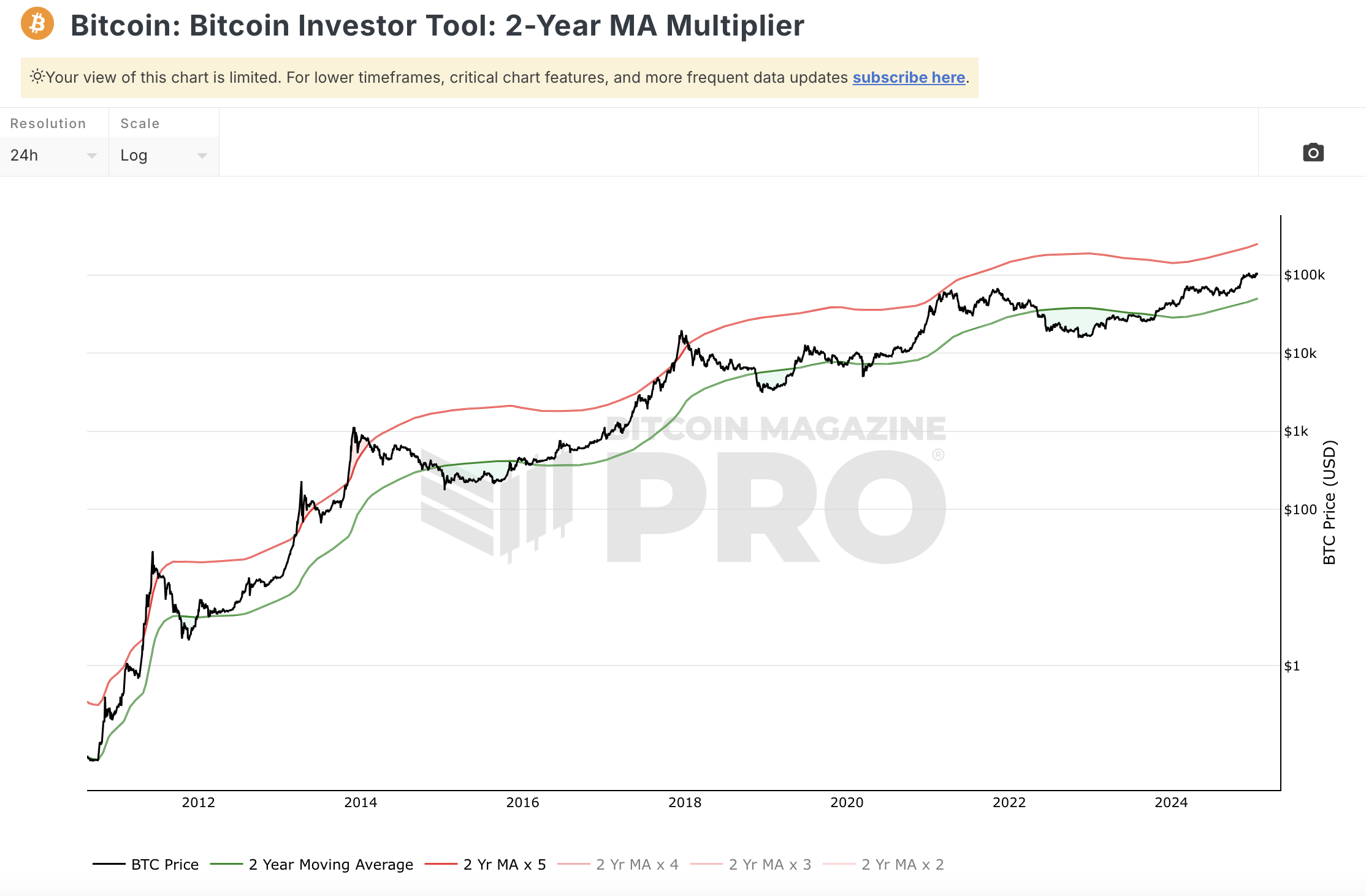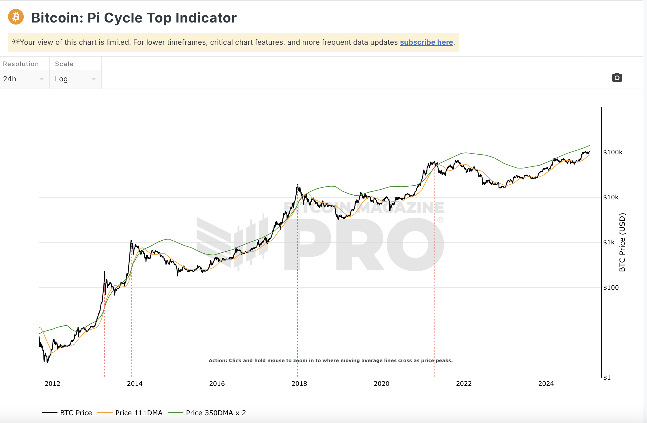 Historisch erreichte der BTC Kurs in jedem Zyklus Höhepunkt die rote Linie, von welcher er zum aktuellen Preis von 100.000 USD noch weit entfernt ist. Dementsprechend gibt dieser Indikator noch kein Verkaufssignal.
