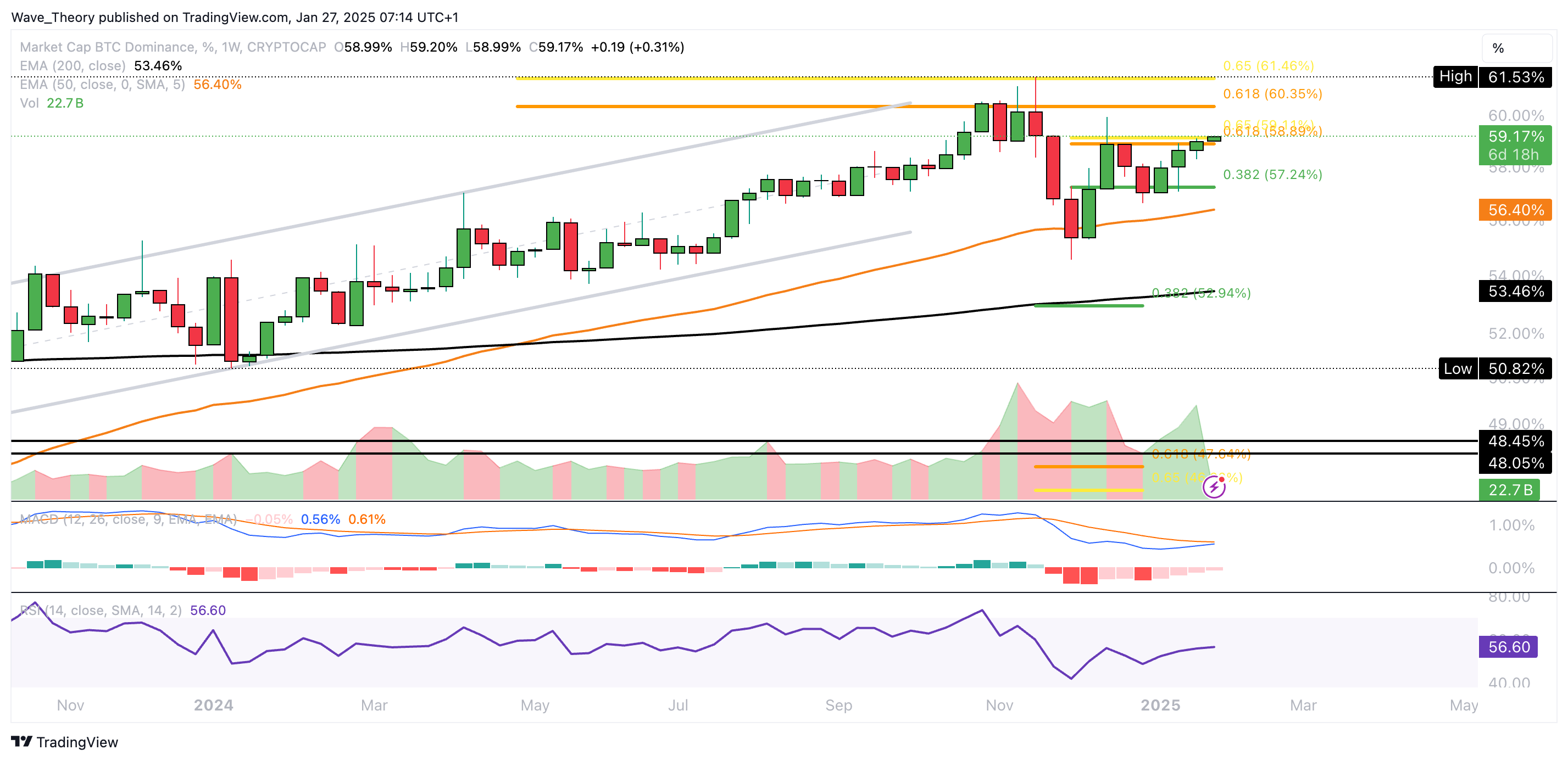 Die Bitcoin Dominanz befindet sich erneut am Golden Ratio Widerstand bei rund 59 %. Bricht sie bullisch aus, wartet bereits bei rund 60,5 % der nächste signifikante Fibonacci Widerstand.