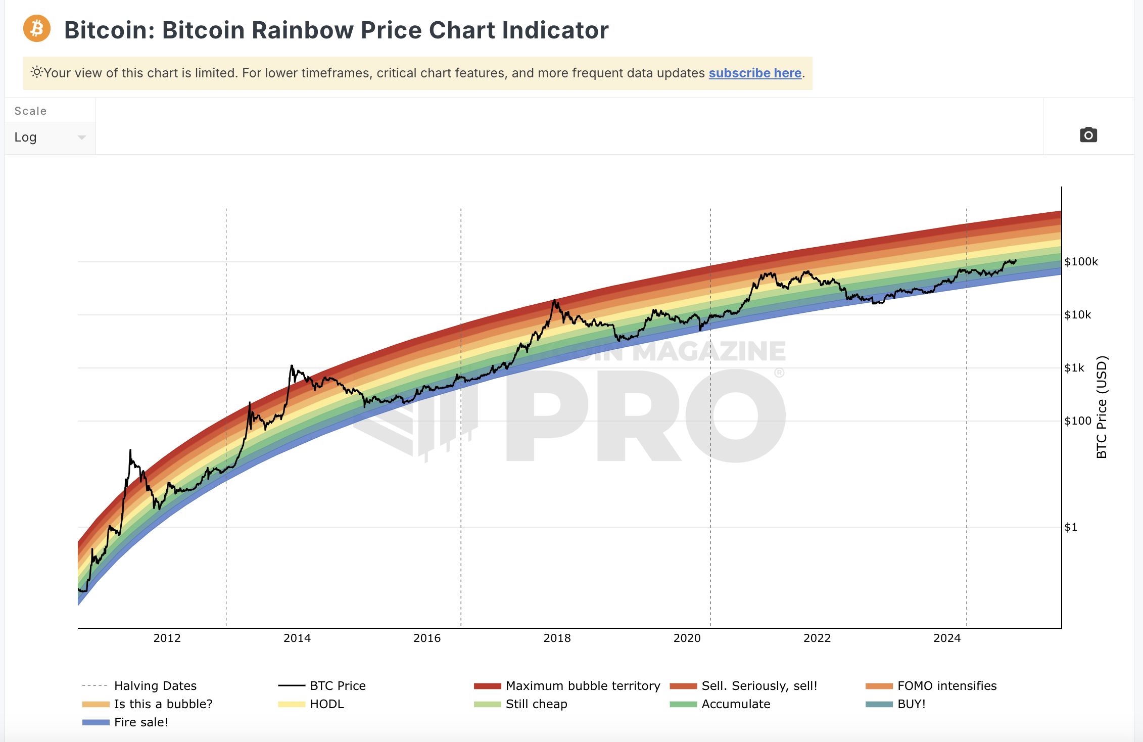 Das Bitcoin Rainbow Chart zeichnet das logarithmische Wachstum von Bitcoin ab und zeigt mithilfe einer Farbskalierung, ob der Bitcoin-Preis über- oder unterbewertet ist. In vergangenen Zyklus-Höhepunkten erreichte der BTC Kurs zumindest den orangen Bereich.