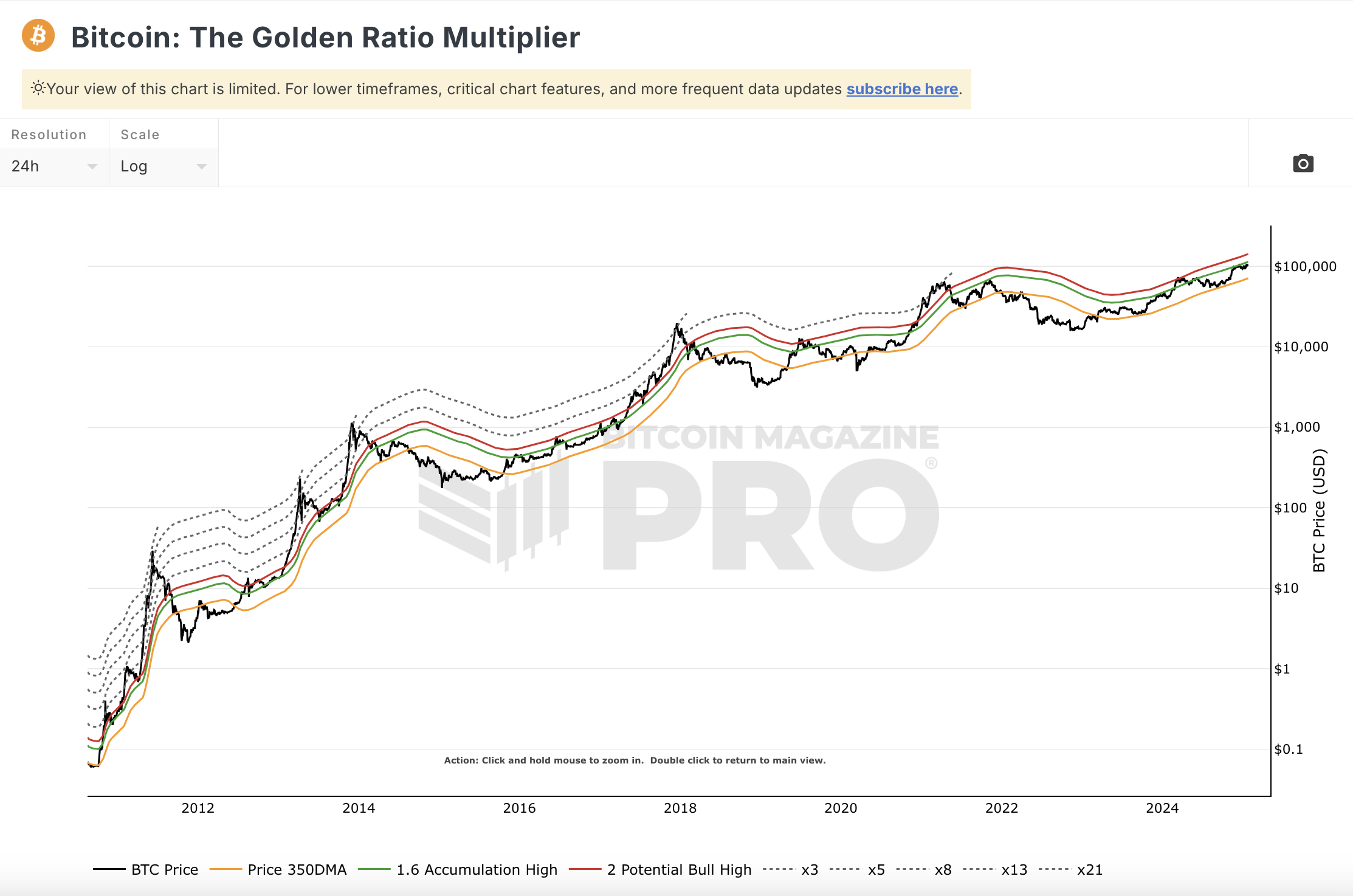 Der Golden Ratio Multiplier markiert mithilfe von Vielfachen des 350-Tage-Durchschnitts und Fibonacci Levels mögliche Widerstände, wobei es aufzeigt, dass die Marktzyklus-Höchststände von Bitcoin im Laufe der Zeit zunehmend niedrigere Fibonacci-Multiplikationen des 350DMA erreichen, da das logarithmische Wachstum abnimmt.