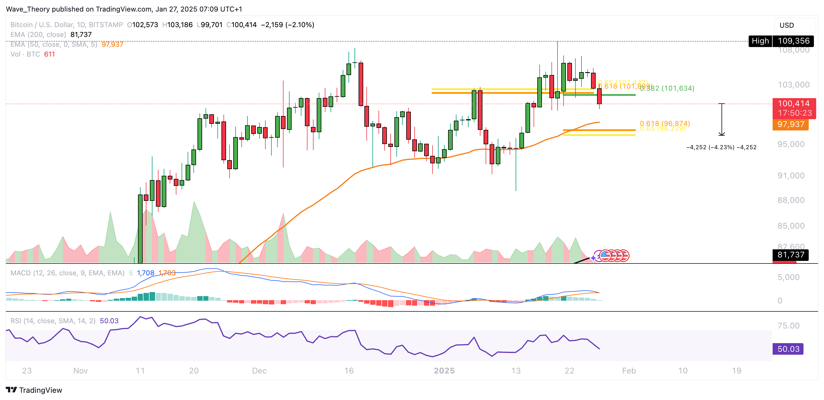 Bitcoin konnte das neue ATH von 109.356 USD nicht lange aufrechterhalten. Stattdessen ist Bitcoin jetzt unter die 0,382 Fib Unterstützung bei rund 101.630 USD gefallen.