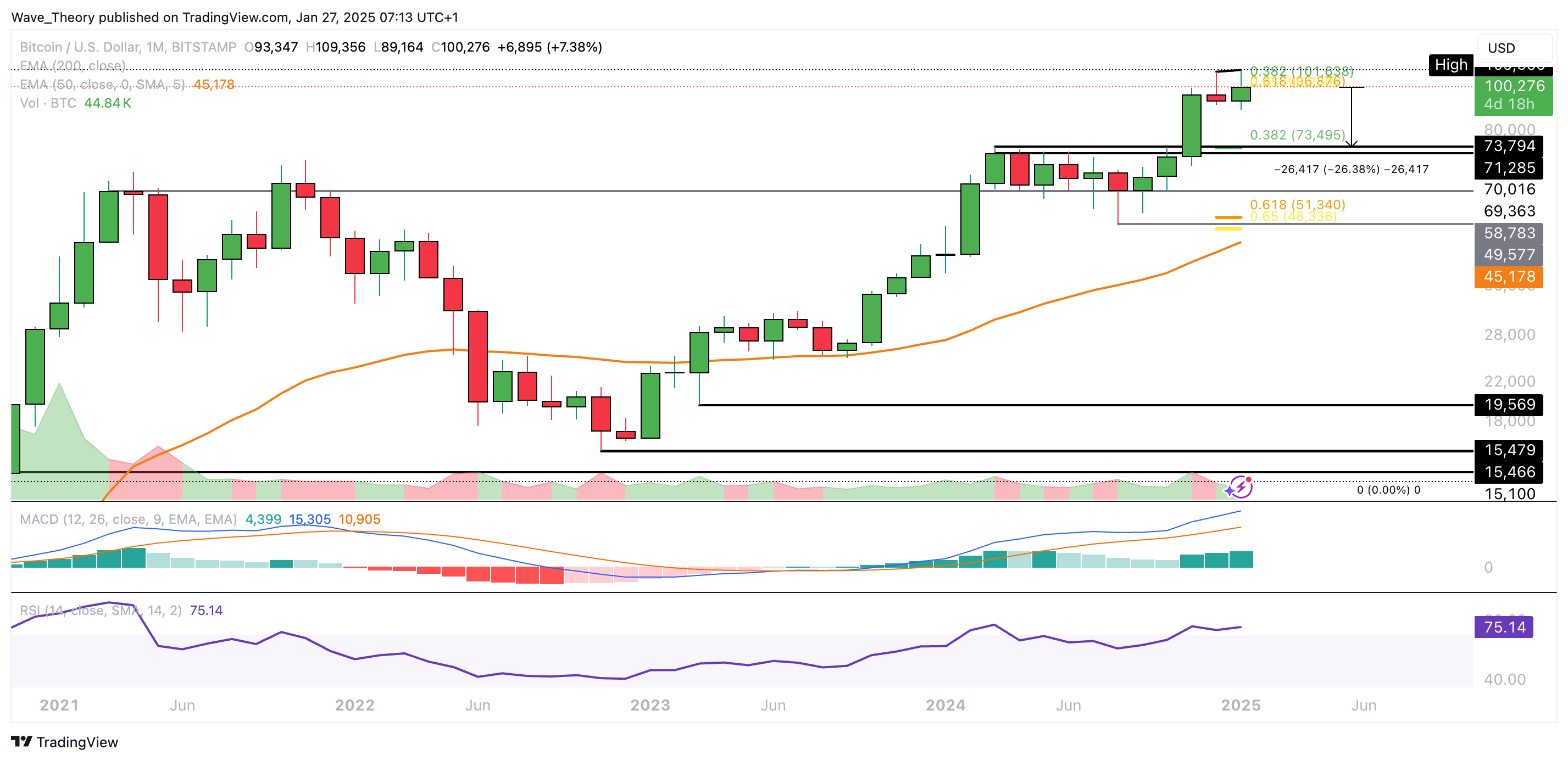 Dort wartet ein wichtiges 0,382 Fib Niveau und der 50-Wochen-EMA, neben einer horizontalen Unterstützungszone. Da der RSI eine massive bärische Divergenz abzeichnet und Bitcoin womöglich jetzt ein bärisches Double-Top Kursmuster formen könnte, ist ein Crash auf rund 74.000 USD definitiv im Bereich des Möglichen.