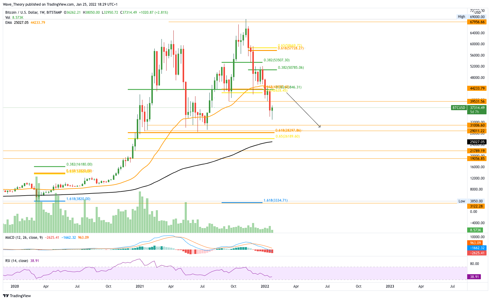 Der Bitcoin Kurs prallte von der Preismarke bei rund 33.000 USD ab. An diesem Preisniveau liegt jedoch keine Unterstützung, weshalb Bitcoin mit hoher Wahrscheinlichkeit seinen Abwärtstrend fortsetzten wird. Auch im wöchentlichen MACD oder RSI gibt es keinen Hinweis auf einen Trendwechsel. Im Gegenteil: die MACD Linien sind bärisch überkreuzt und das Histogramm tickt bärisch nach unten, während sich der RSI überverkauften Regionen nähert, dabei aber keine bullische Divergenz aufbaut.