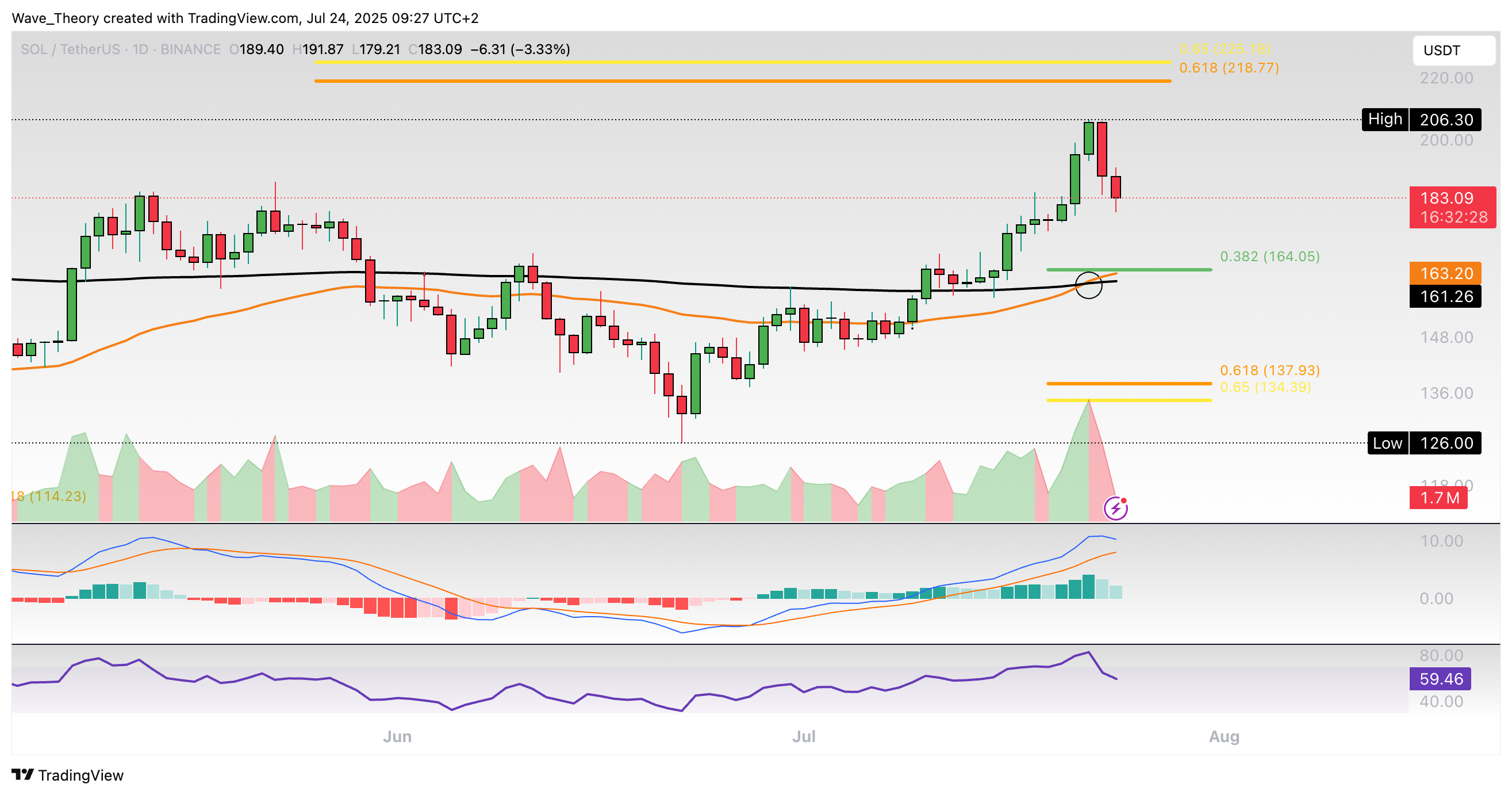 Solana-Prognose für Donnerstag, 24. Juli 2025: Der Solana Kurs hat bei rund 206 USD ein Hoch etabliert und scheint jetzt zu korrigieren.