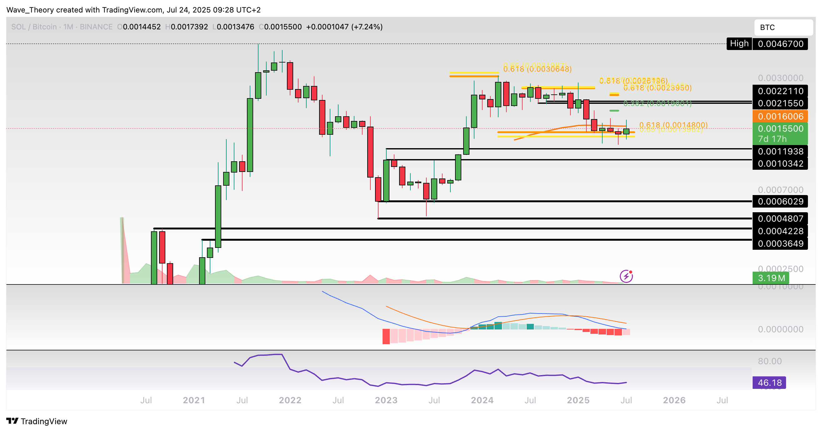 Gegen Bitcoin hält sich Solana an der Golden Ratio Unterstützung bei rund 0,00148 BTC. Dort könnte Solana jetzt bullisch abprallen, um zum 0,382 Fib Widerstand bei rund 0,00196 BTC zu steigen.