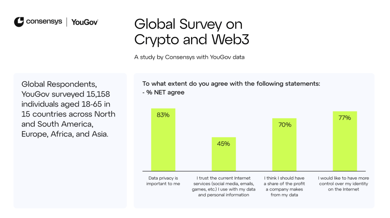 Der Ruf nach mehr Kontrolle über Online Identitäten und Datenschutz wird immer lauter. Eine weltweite Umfrage des Ethereum Technologieanbieters ConsenSys ergab, dass 79 Prozent der Befragten mehr Kontrolle über ihre Online Identität wünschen. Die überwiegende Mehrheit legt auch Wert auf Datenschutz.