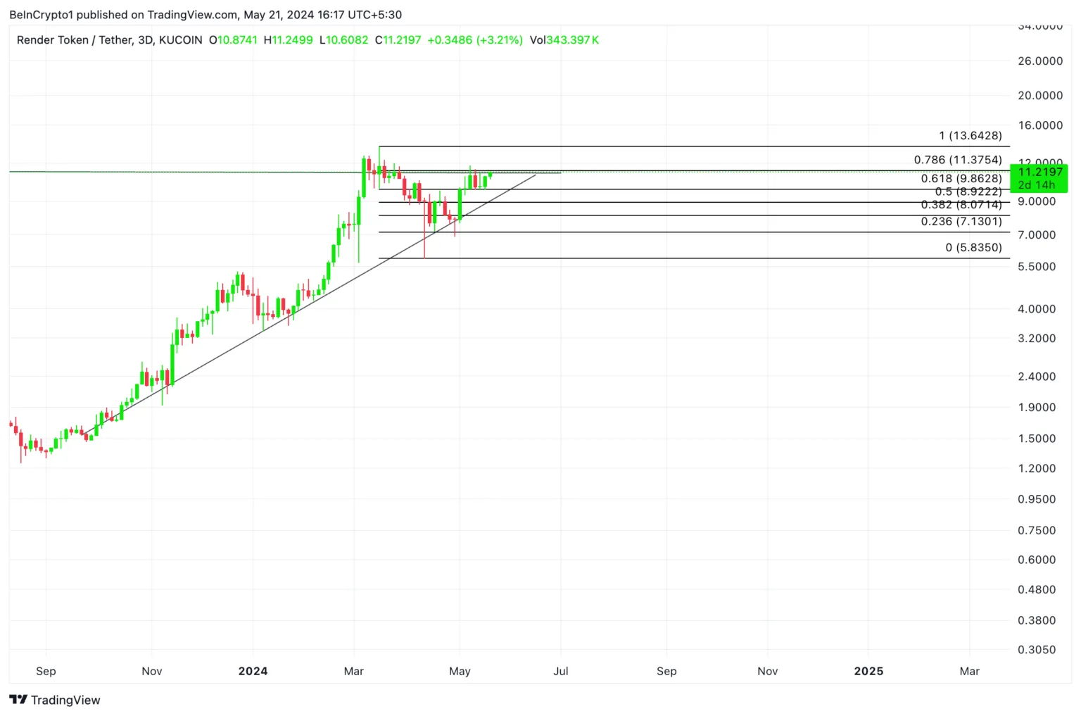 Die AI Kryptowährung Render (RNDR) ist im Begriff, aus einem bullischen Chartmuster auszubrechen. Sollte dies gelingen, würde der Token als Nächstes sein Allzeithoch bei 13,65 USD anvisieren.
