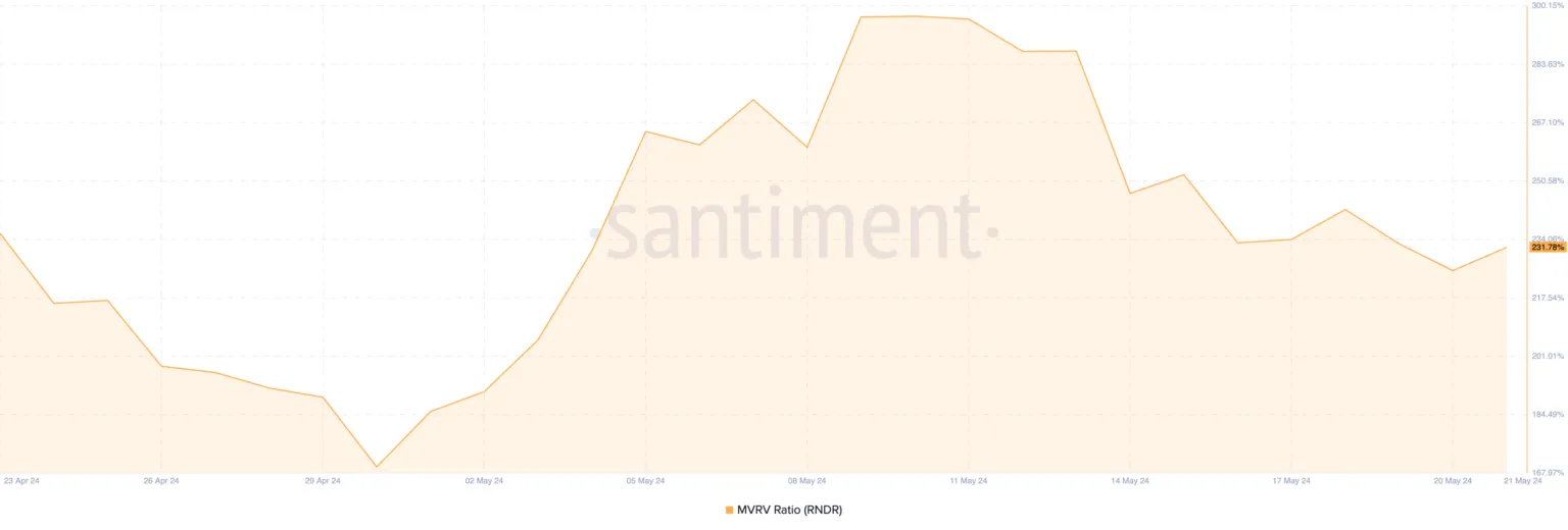Diese negative Stimmung kommt zu einem Zeitpunkt, an dem das Verhältnis von Marktwert zu realisiertem Wert (MVRV) des Tokens recht hoch ist – etwa 231,78 Prozent.
