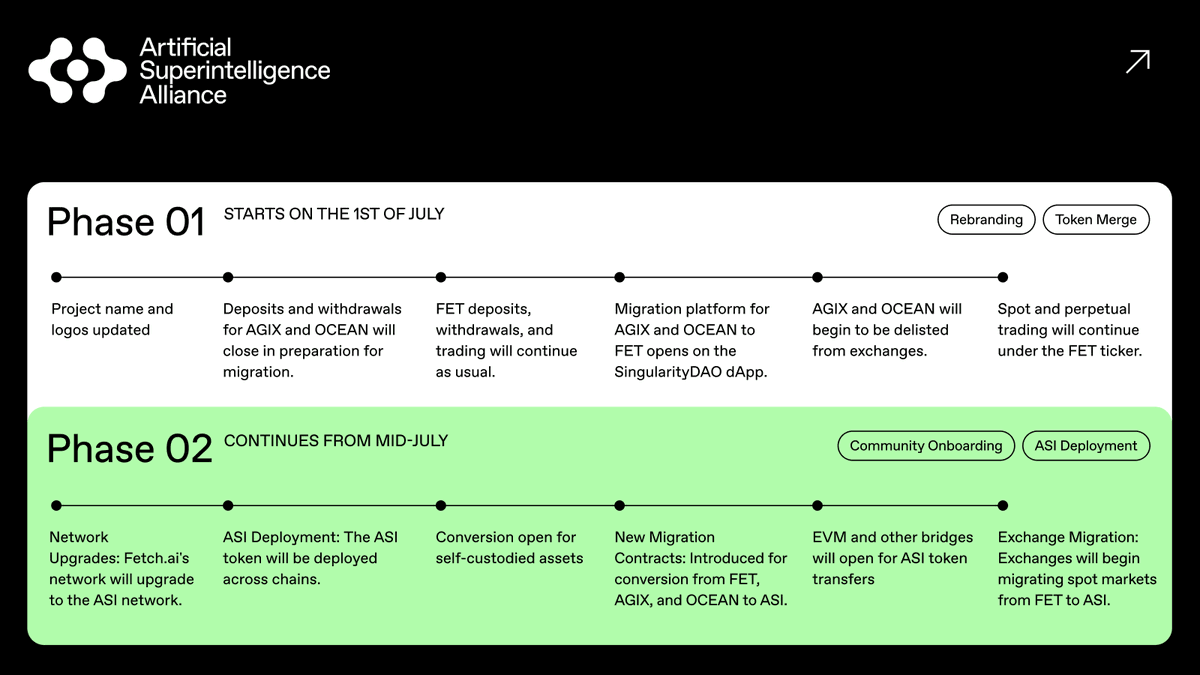 Ferner konzentriere sich die erste Phase darauf, OCEAN- und AGIX-Tokens in FET zu überführen. Diese Anfangsphase beinhaltet das Schließen von Einzahlungen und Abhebungen für AGIX und OCEAN, um die Migration vorzubereiten.