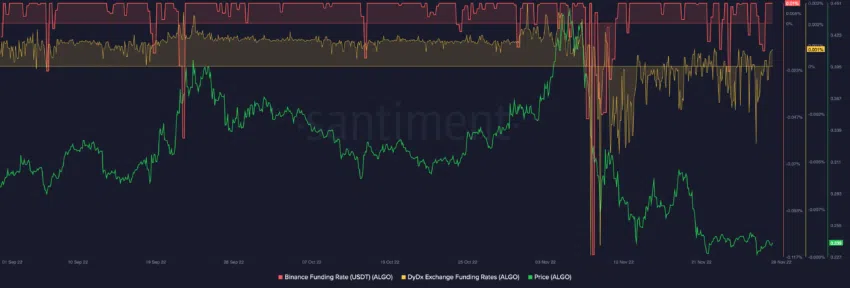Obwohl Algorand mit seiner laufenden Decipher-Veranstaltung einen gewissen Hype auf Krypto-Twitter auslöste, zeigten die sozialen Metriken keine größeren Veränderungen. Das soziale Volumen von ALGO sank seit dem 22. November.