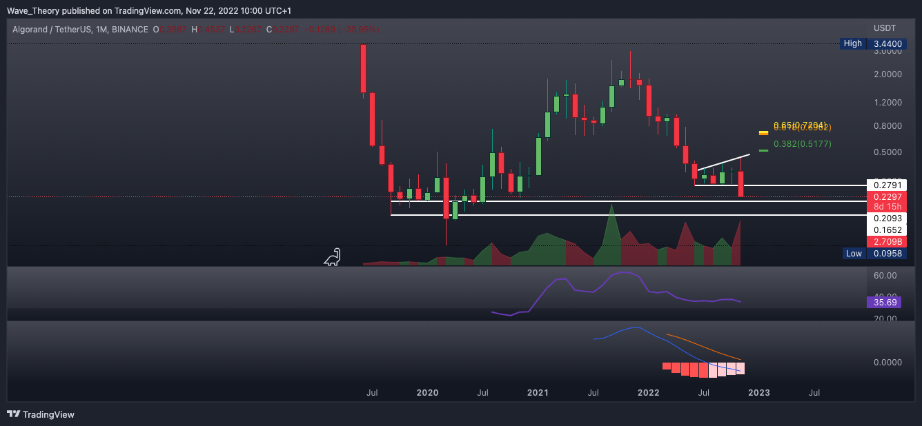 Der Algorand Kurs hat die Unterstützung bei rund 0,279 USD bärisch gebrochen und befindet sich damit auf einem neuen Jahrestief. Algorand stößt jetzt zwischen 0,165 USD und 0,209 USD auf signifikante Unterstützung.
