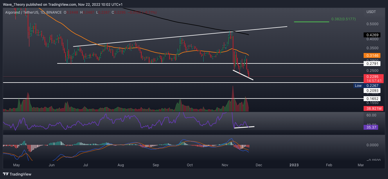 Der ALGO Kurs hat die Unterstützung gebrochen und ist dabei, eine Etage tiefer zu fallen. Doch dort könnte Algorand sehr stark bullisch abprallen.