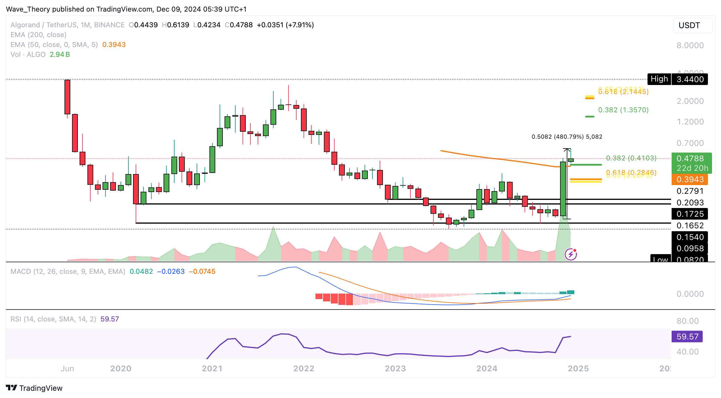 Algorand konnte sich über der Unterstützung zwischen rund 0,095 USD und 0,154 USD halten und ist seither rund 480 % gestiegen. Damit konnte Algorand den 50-Monate-EMA Widerstand bei rund 0,394 USD überwinden.
