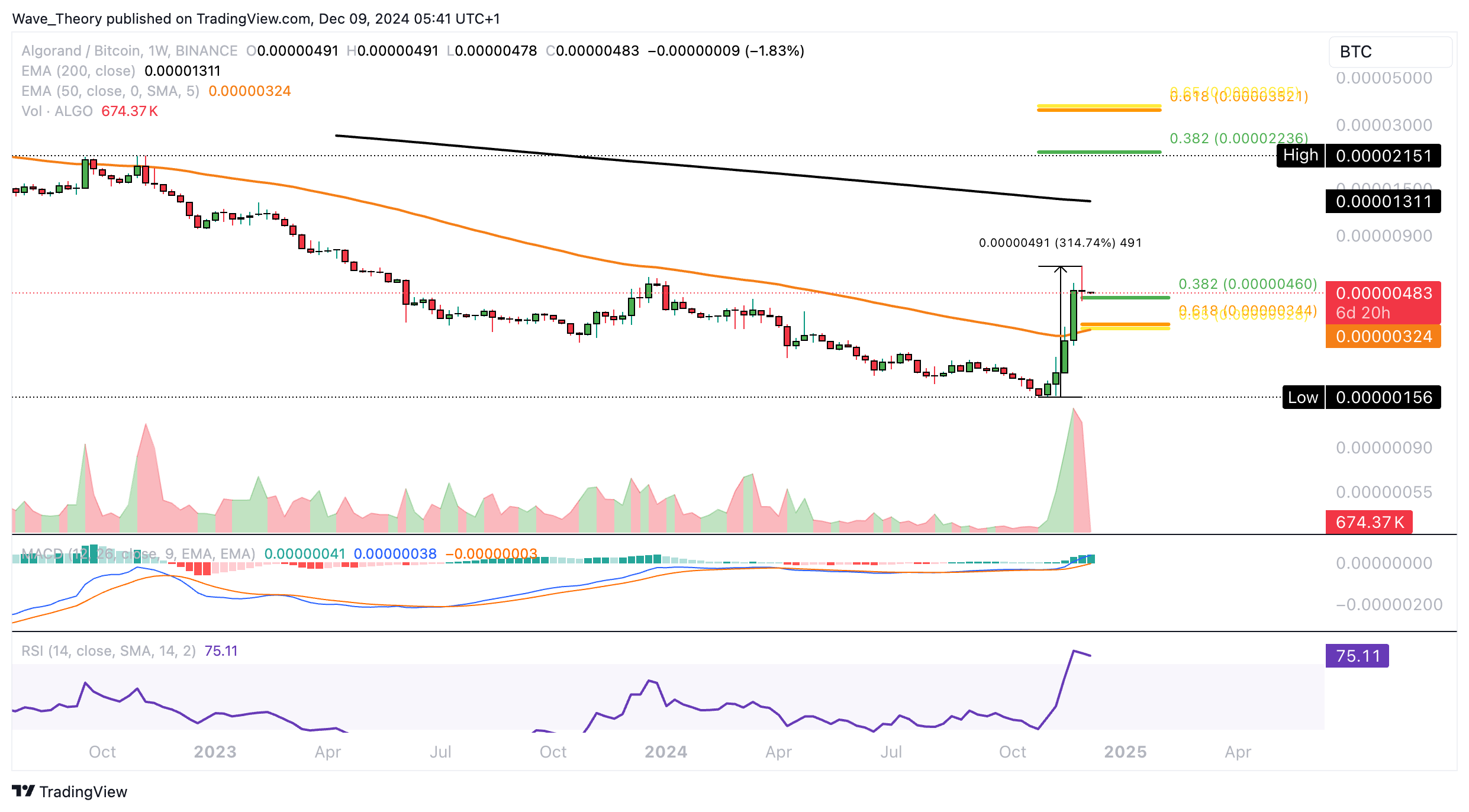 Derzeit scheint Algorand zu korrigieren. Er stößt dabei bei rund 0,000046 BTC und bei rund 0,0000034 BTC die nächsten signifikanten Fibonacci Unterstützungen.