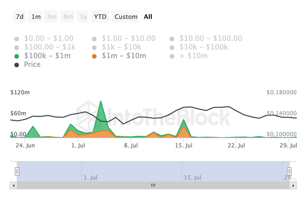 Laut Daten von IntoTheBlock ist die tägliche Anzahl von Wal-Transaktionen im Wert zwischen 100.000 und einer Million USD in diesem Zeitraum um 89 Prozent zurückgegangen. Ebenso hat sich die Anzahl größerer Transaktionen im Wert zwischen 1 Million und 10 Millionen USD um 100 Prozent verringert.
