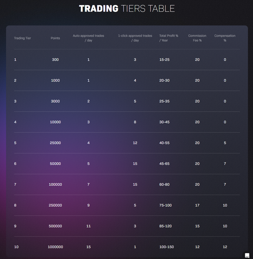 Wie viel ein Händler mit seiner Investition verdienen kann, hängt davon ab, auf welcher Handelsstufe er sich befindet, da AlgosOne einen Händler je nach Höhe seiner Einlage einer bestimmten Stufe zuordnet. AlgosOne hat 10 verschiedene Handelsstufen, von denen jede eine bestimmte Anzahl täglicher Trades, Provisionen, Vergütungen und einen Gesamtgewinn pro Jahr bietet.