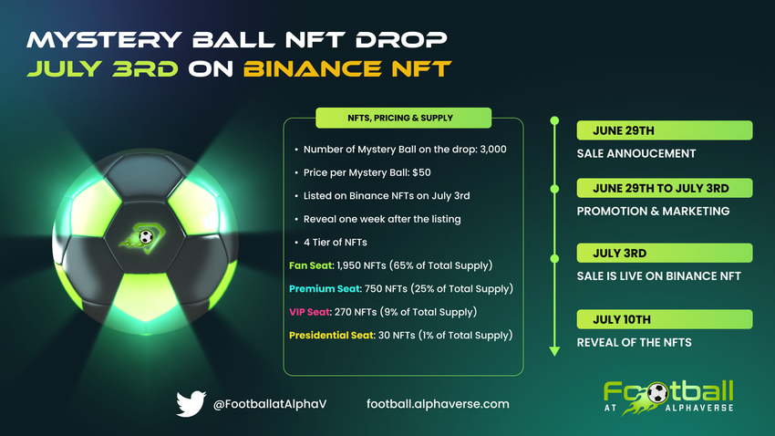 Football at AlphaVerse (FAV) ist bereit, mit seinem ersten NFT-Verkauf die globale Bühne zu betreten. Am 3. Juli werden insgesamt 3.000 Mystery Boxen, jede mit einem Preis von 50 Dollar, auf Binance NFTs gelistet werden.