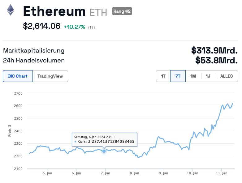 Der heutige Ethereum Kurs (ETH) zeigt eine beeindruckende Dynamik, insbesondere nach der Ankündigung der SEC. ETH, das von vielen als unterbewertet angesehen wurde, stieg um über zehn Prozent auf 2,614 USD, der höchste Kurs seit Anfang Mai 2022.