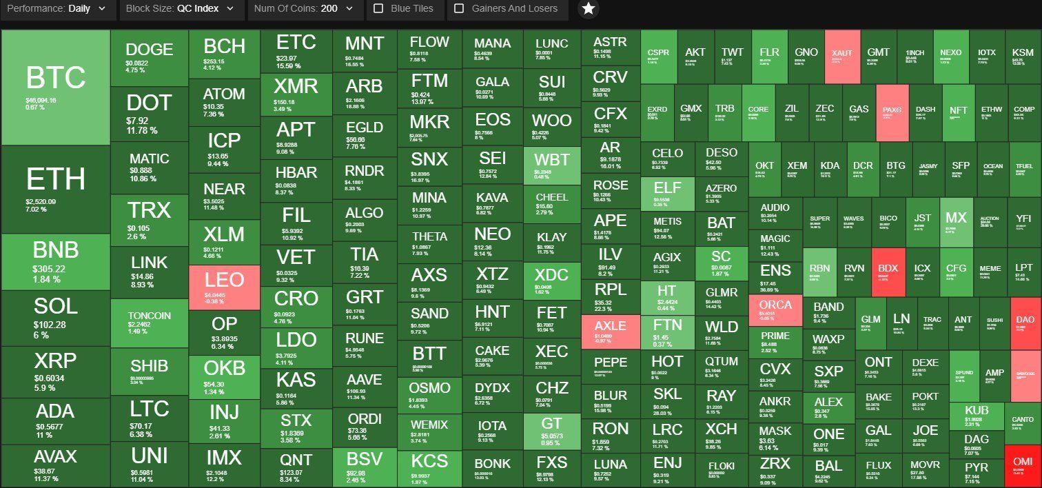 Weitere Coins mit zweistelligen Kursgewinnen sind Uniswap (UNI), Ethereum Classic (ETC), Optimism (OP), Near Protocol (NEAR), Filecoin (FIL), Arbitrum (ARB) und Immutable (IMX).
