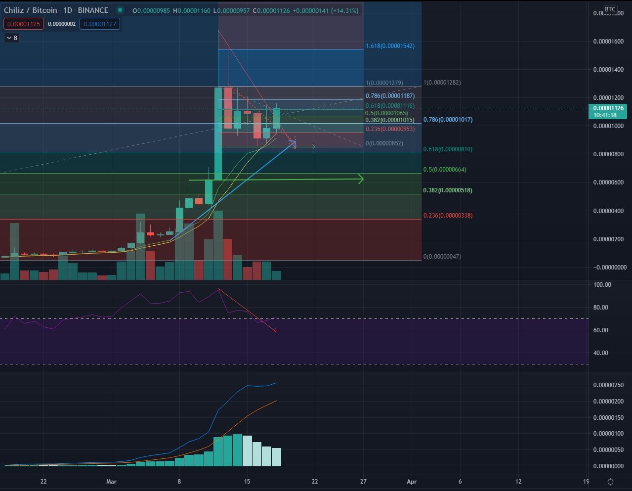 Laut unserer Bitcoin Analyse vom 18. März 2021 wird der Bitcoin Preis voraussichtlich bald auf ein neues Allzeithoch bei ca. 67.000-68.000 USD ansteigen, bevor eine Korrekturphase einsetzt. Lasst uns also den CHZ/BTC ansehen, um eine noch bessere Prognose erstellen zu können.