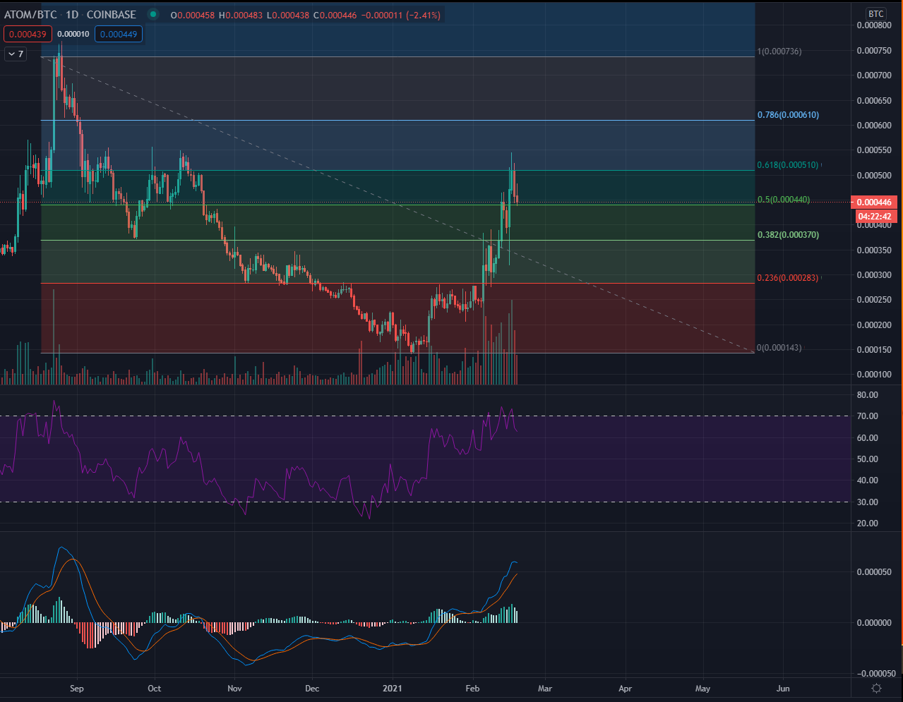 Unabhängig davon, ob der ATOM/BTC Kurs kurzfristig fallen oder steigen wird, wird es noch eine Zeit lang dauern, bis er in die Nähe des Allzeithochs angelangt ist. Aktuell sieht es so aus, als ob der ATOM/BTC-Kurs in einer kleinen Korrekturphase ist. Sowohl der MACD als auch der RSI signalisieren, dass die aktuelle Rally an Fahrt verloren hat. Aktuell testet er das Support-Level bei 0.000440 BTC. Das Level ist entscheidend für den kommenden Kursverlauf. Sollte er das Level als Support verlieren, könnte er auf das Support-Level bei 0.000370 BTC fallen. In den nächsten Tagen wird sich also entscheiden, wie lange die aktuelle Korrekturbewegung noch anhält.
