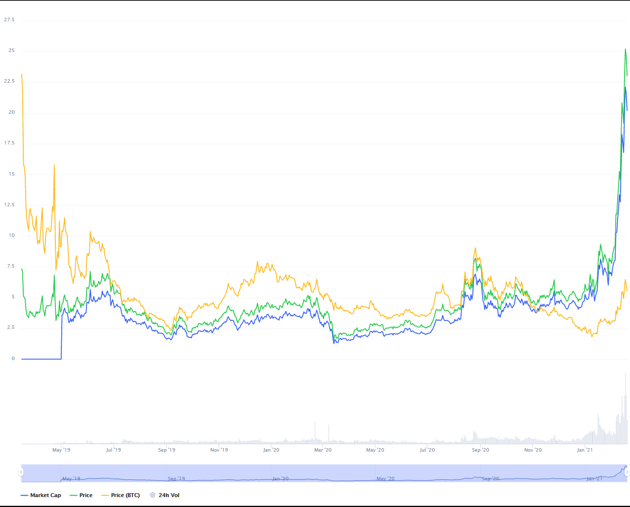 Auf dem Chart von Coinmarketcap sieht man, dass der Cosmos Kurs am 16. Februar 2021 ein neues Allzeithoch bei 26.42 USD erreicht hat.