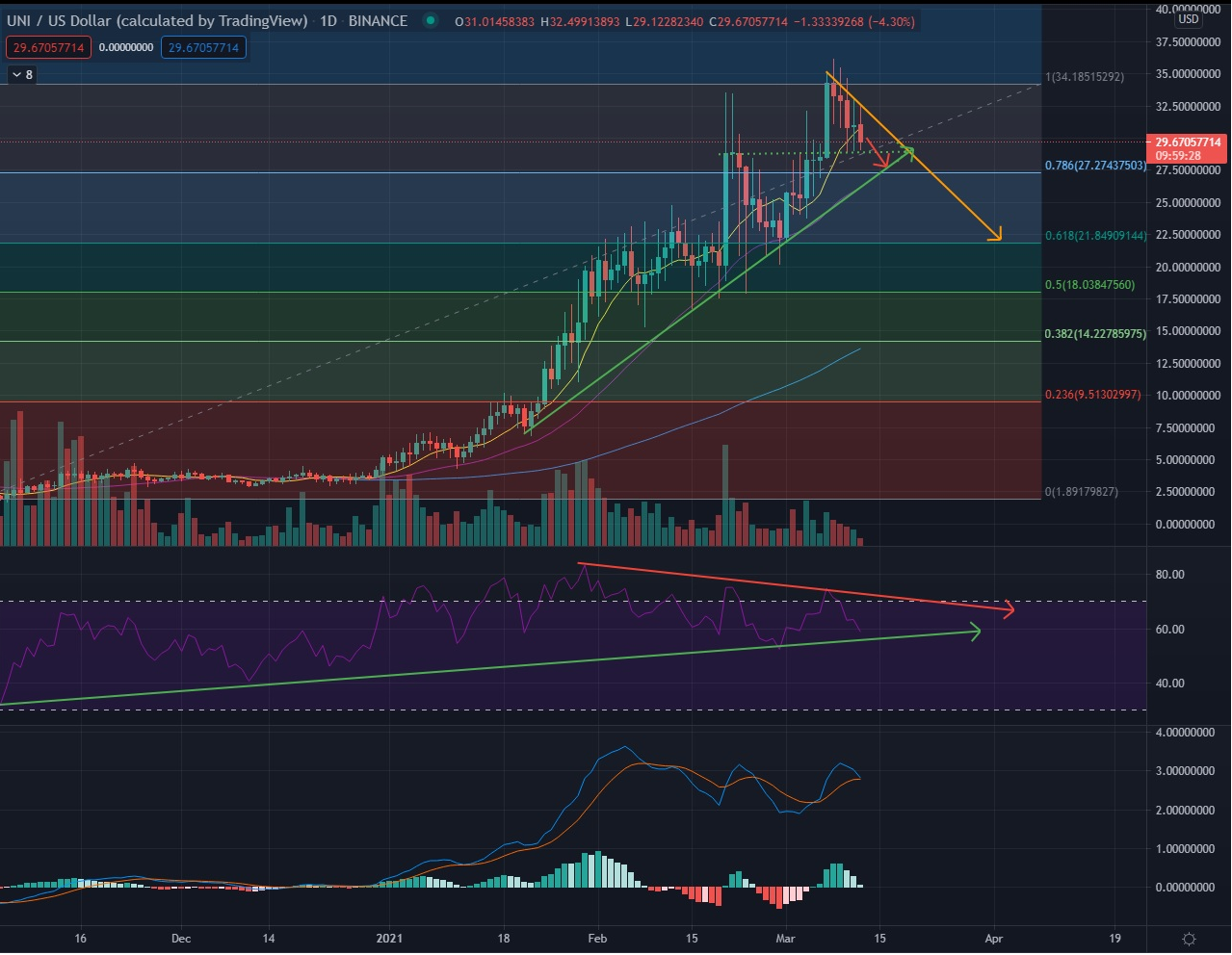 Der UNI Preis folgt einer kleinen absteigenden Trendlinie, andererseits und aufsteigenden Langzeit-Trendlinie. Der UNI Preis wird also kurzfristig weiter sinken. Falls er unter die grüne Unterstützungslinie fällt, die sich mit dem 0.786-Fib-Retracement-Level (27.40 USD) und der roten Widerstandslinie schneidet, dann wird er auch mittelfristig fallen und dabei die bullische Langzeitdivergenz invalidieren.