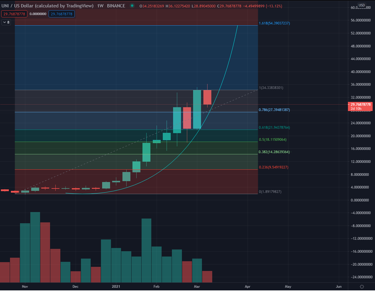 Auf dem Wochenchart sieht man, dass der UNI Kurs einer parabolischen Unterstützungslinie gefolgt ist. Solange diese intakt ist, wird der UNI Preis wahrscheinlich weiter steigen. Darum könnte der UNI Preis, wenn er über das letzte Allzeithoch ausbricht, bis auf über 50 USD ansteigen.