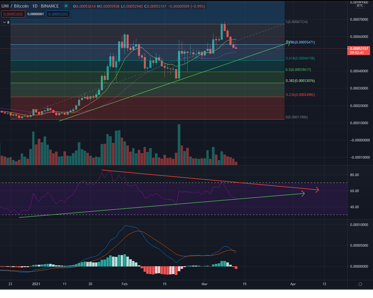 Der UNI/BTC Preis hat ebenfalls vor kurzem ein neues Allzeithoch erreicht, ist aber seitdem wieder unter das vorherige gefallen.