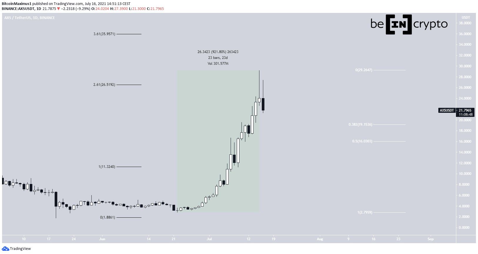 Der AXS Kurs ist seit dem 22. Juni 2021 ziemlich schnell angestiegen. Der AXS Kurs hatinnerhalb von 23 Tagen um 921% zugelegt Am 15. Juli 2021 erreichte der AXS Preis das letzte Allzeithoch (29.20 USD).