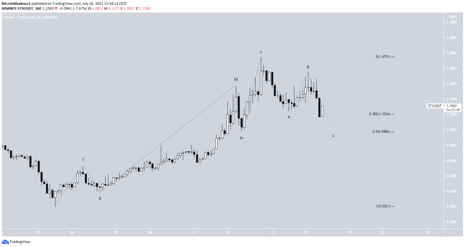Der STX Preis ist seit dem 22. Juni 2021 angestiegen. Damals fiel der STX Kurs auf das letzte Swing Low bei 0.50 USD. Danach gab es eine Aufwärtsbewegung, die bis zu dem Hochpunkt vom bei 1.47 USD (11. Juli 2021) angehalten hat. Es sieht so aus, als ob der STX Kurs die fünfte Welle eines bullischen Impulses abgeschlossen hat.