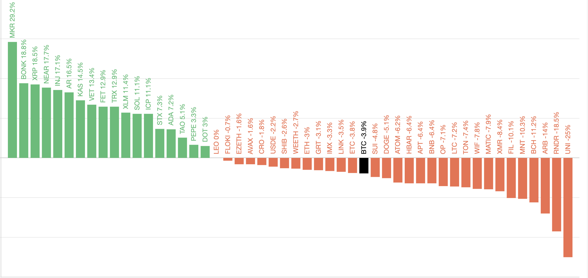 Zu den drei Top-Assets, die Bitcoin in den letzten drei Monaten übertroffen haben, gehören der DeFi-Token MakerDao (MKR), der Memecoin Bonk (BONK) und Ripple (XRP).