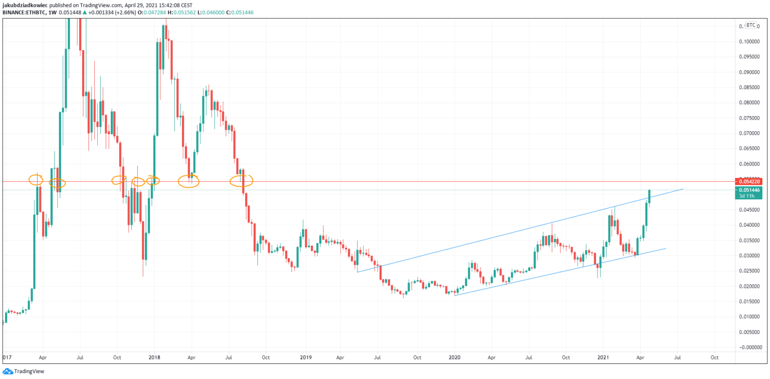 „Sollte sich die aktuelle Aufwärtsbewegung fortsetzen, dann könnte der ETH/BTC Kurs um 40% und auf das nächste wichtigen Level bei 0.05 BTC ansteigen.“