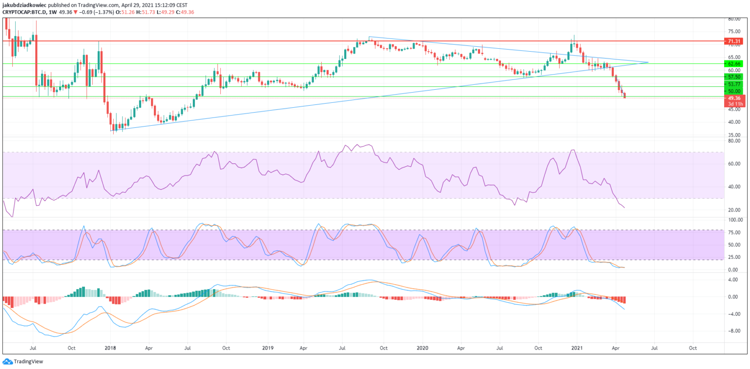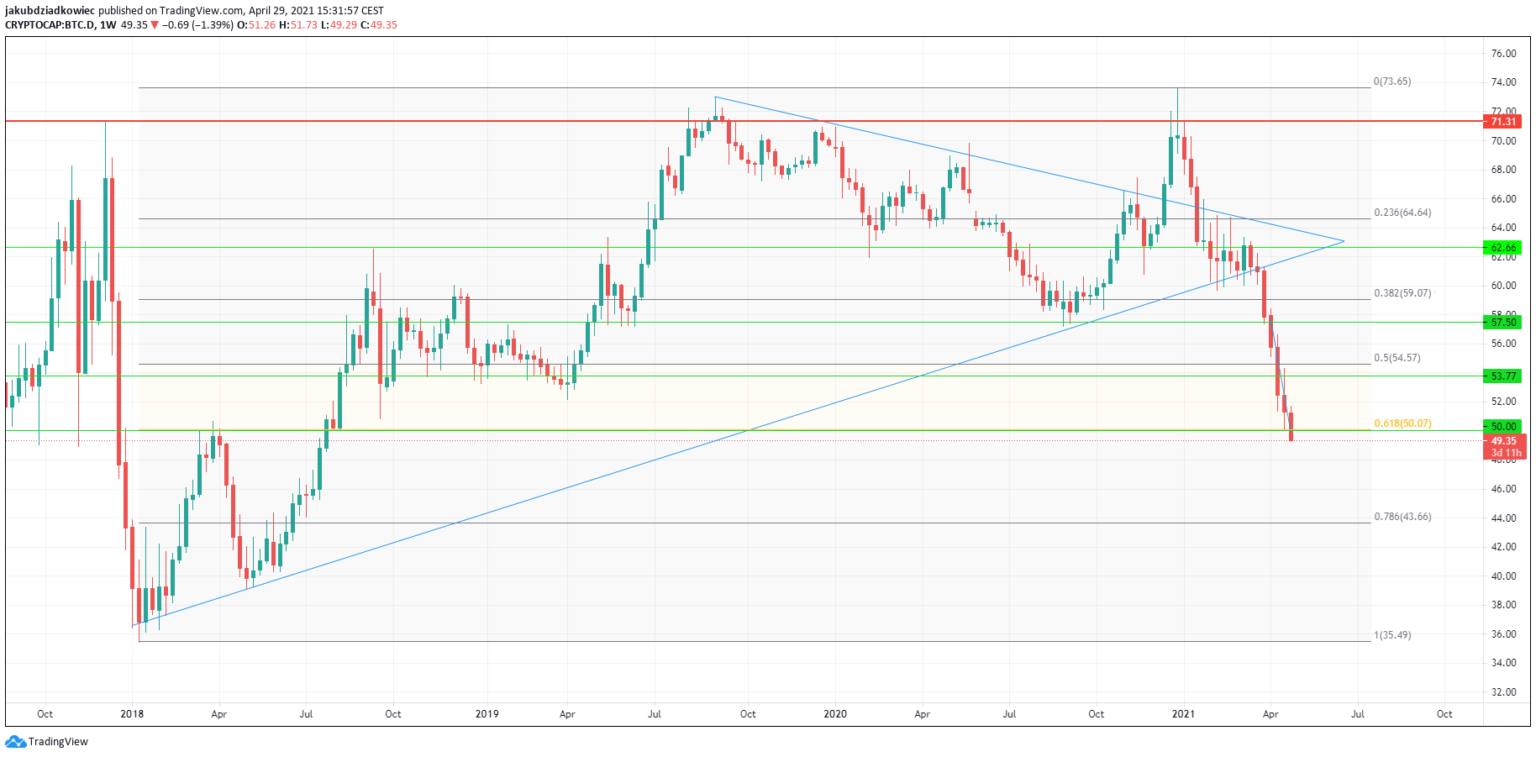 Die Bitcoin Dominance Rate (BTCD) ist am 30. April 2021 auf unter 50% gefallen. Im Juli 2018 durchbrach die BTCD dieses Level und ist seitdem nicht mehr auf unter 50% gesunken. Die 50%-Marke spielte in der Vergangenheit des Öfteren eine entscheidende Rolle und fungierte sowohl als Widerstands- als auch als Unterstützungs-Level. Außerdem hat 50%-Marke auch einen psychologischen Einfluss, da der Bitcoin alleine nicht mehr die Mehrheit der Krypto-Marktkapitalisierung hat.