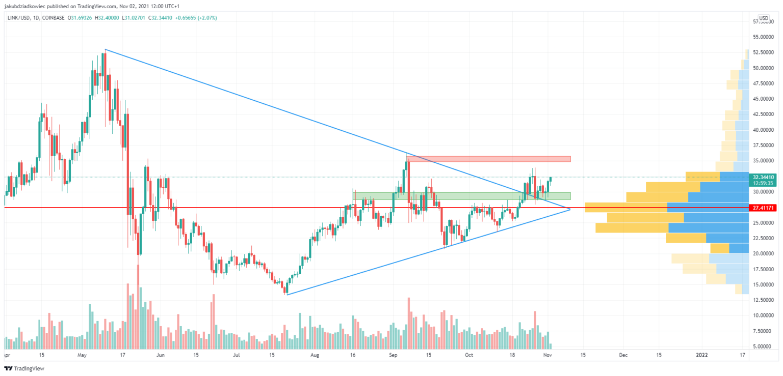Der Chainlink Kurs (LINK) brach beispielsweise über den Widerstandsbereich im Bereich von 29-30 US-Dollar aus und durchbar gleichzeitig über die unten gezeigte, langfristigen fallenden Widerstandslinie (blau) aus. Sobald die beiden Bereiche als Unterstützung bestätigt sind, könnte der Altcoin den Aufwärtstrend fortsetzen und anschließend den wichtigen Widerstandsbereich bei 35 US-Dollar überwinden. Falls der Chainlink Kurs außerdem diese Widerstände überwindet, dann gibt es auf dem Weg zum letzten Allzeithoch (53 USD) nicht mehr viel Widerstand.