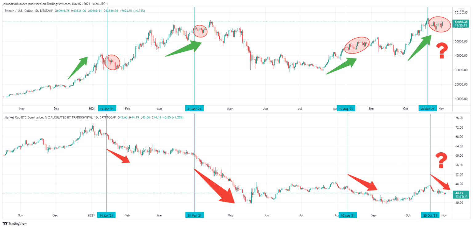 Auch der Chart der Bitcoin-Dominanz (BTCD) deutet auf eine mögliche Altcoin-Saison hin. Die Bitcoin Dominanz ist der Marktanteil bzw. die Marktkapitalisierung von Bitcoin im Vergleich zur Krypto-Gesamtmarktkapitalisierung. Zwischen dem 10. September 2021 und dem 19. Oktober 2021 ist die BTCD um 20% gestiegen. Seitdem hat die Dominanz von Bitcoin jedoch abgenommen.